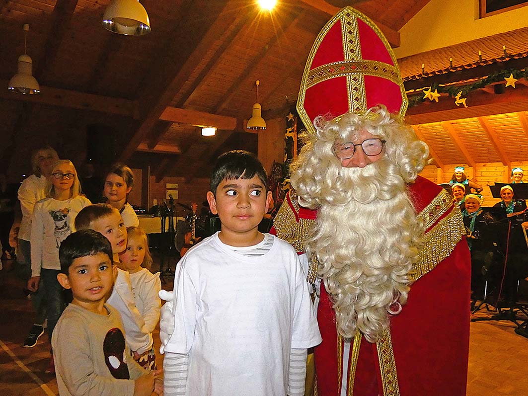 Ebenso wie alle Zuschauer war auch der Nikolaus hin und weg: „Ihr habt mir eine große Freude gemacht.“ Zwar hatte er keinen Sack dabei, dafür jedoch einen hölzernen Schlitten. Und der war mit Geschenktüten bepackt. Namentlich rief er alle im Saal anwesenden, rund 20 Kinder der Reihe nach auf, um sie zu bescheren.
