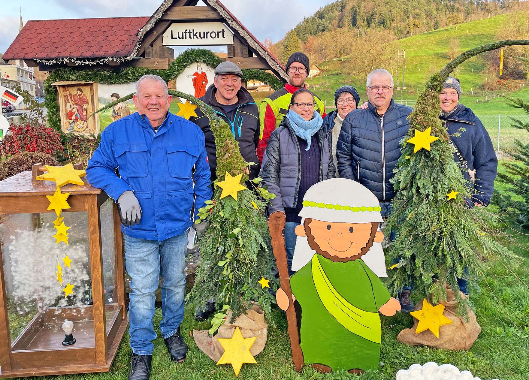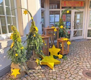 Pünktlich zum ersten Advent ist das Dorf mit unzähligen gelben Holzsternen und liebevoll gebundenen Weihnachtswichtelbäumen geschmückt. Diese wurden mit Helfern in Handarbeit unter Leitung des Gärtner/innen-Teams der Gemeinde hergestellt.