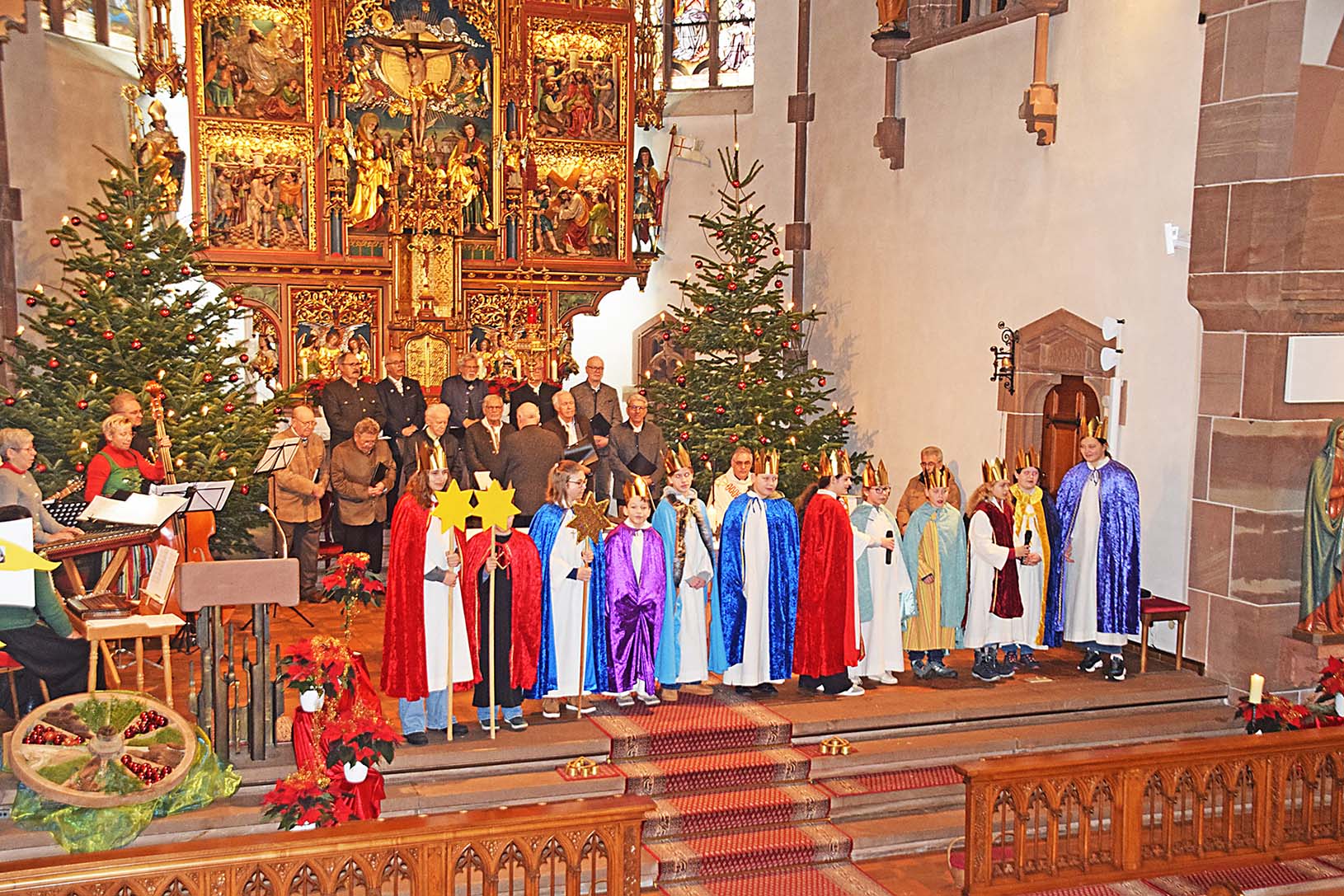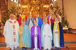 Vierzehn Buben und Mädchen hatten sich in diesem Jahr bereit erklärt, an mehreren Tagen von Haus zu Haus zu ziehen und Spenden für die Sternsingeraktion zugunsten der Kinder in Bangladesch zu sammeln. Sie nahmen am Gottesdienst in ihren prachtvollen Gewändern teil und spendeten am Ende des Gottesdienstes allen Gläubigen ihren Segensgruß. Pfarrer Gerner dankte den Sternsingern für ihren Dienst, ebenso dem Organisationsteam.