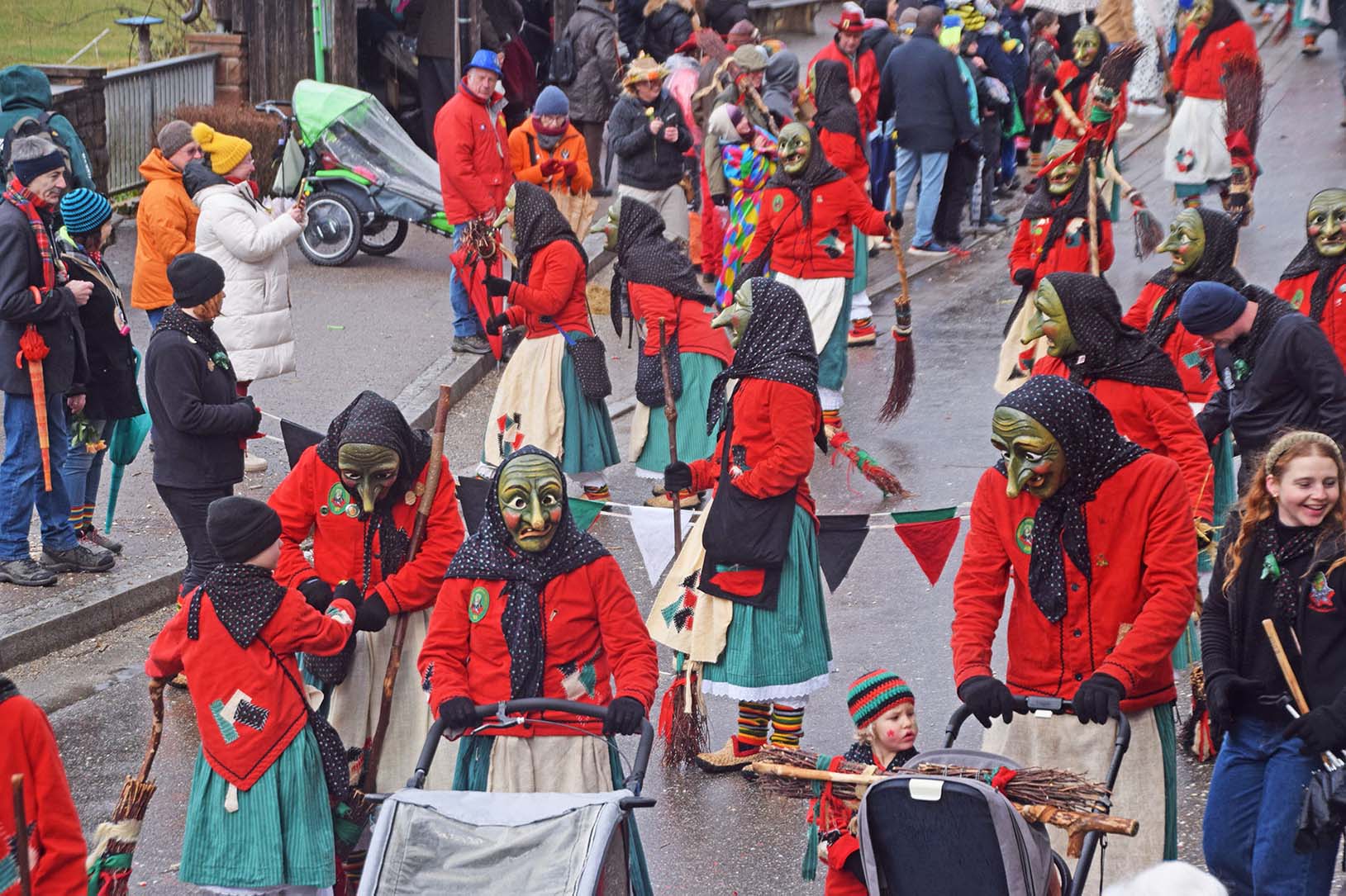 Die Schar der teilnehmenden Unterharmersbacher war unübersehbar. Die Eckwaldpuper sind für ihre exzellente Guggenmusik bekannt, eine Bereicherung für jeden Umzug. Ihr schwarzer Umhang mit giftgrünen Akzenten sticht überall hervor. Ihnen folgten die Eckwaldhexen mit ihren schaurigen Masken.