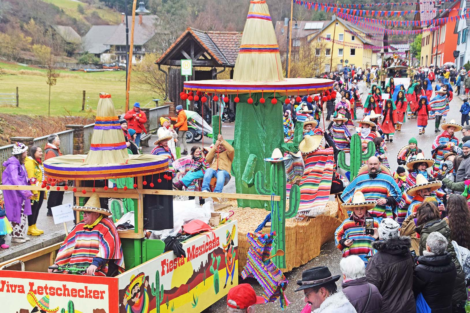 Die Fasentgemeinschaft „Le-tscheck“ scheint eine Vorliebe für Amerika zu haben. Nach „Lucky Luke“ im Vorjahr stellten sie dieses Jahr mexikanische Kaktus-Bauern dar. Auf ihrem Wagen stand ein riesiger Kaktus, der als Karussell diente. In ihrer mexikanischen Kleidung, noch schöner als in Mexiko selbst, boten sie ein tolles Bild. Viva Letschecker!