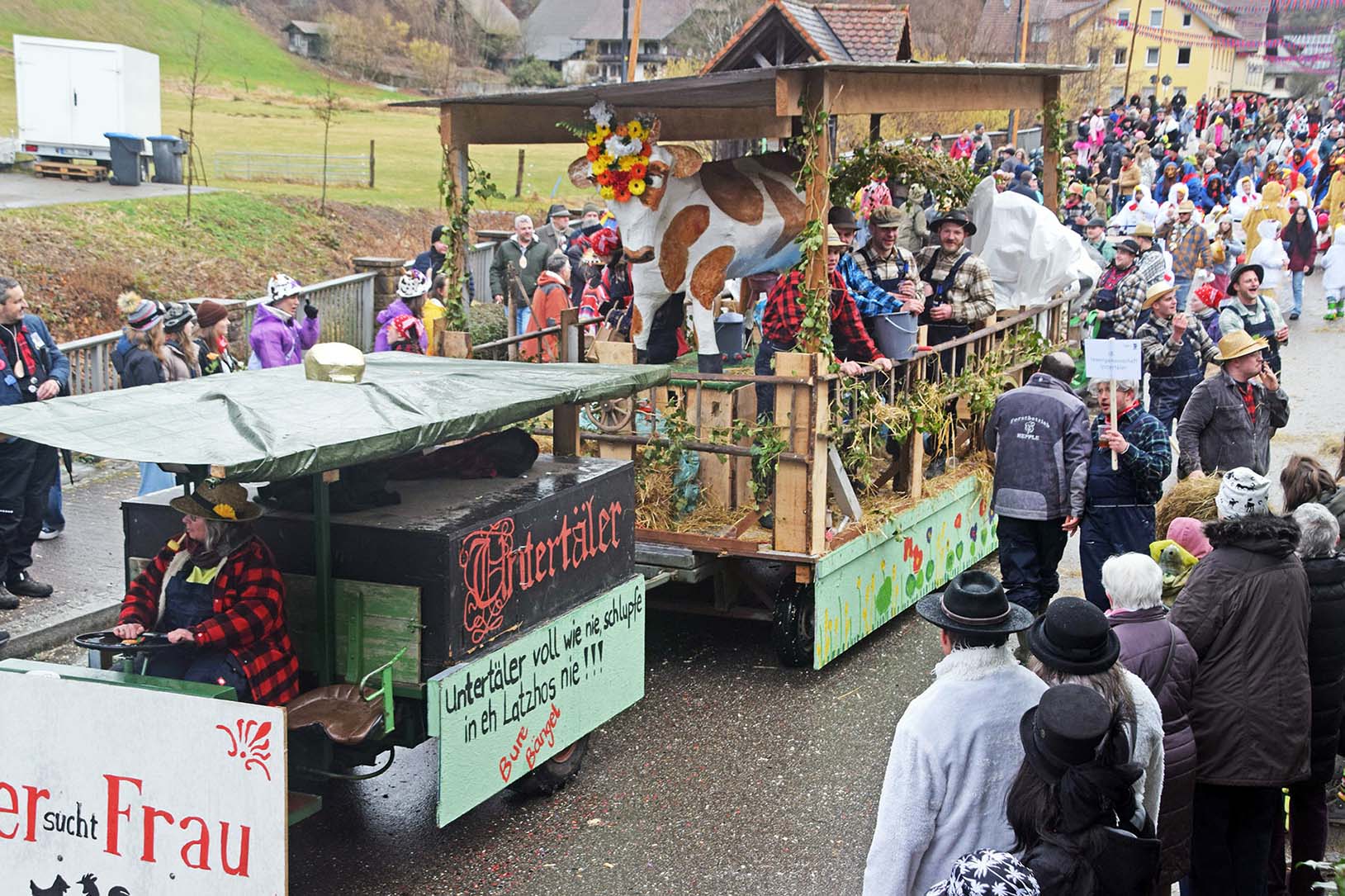 Die Nordracher Fasentgemeinschaft „Die Untertäler“ hatte einen sehenswerten Umzugswagen dabei. Zum Motto „Bauer sucht Frau“ stand auf dem Wagen eine Kuh, an der vorrangig die weiblichen Zuschauer ihr Können beim Melken unter Beweis stellen durften.