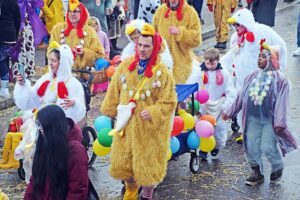 Furchterregend sahen die Hexen-Jäger aus Kinzigtal aus, denen es sicherlich gelingen wird, die bösen Geister des Winters zu vertreiben. Den krassen Gegensatz dazu bot „Nordrachs VIEH-mäßige Geschäftswelt“- s´Blaue Hus, Frische Markt Herbrik und Angelas Fußpflege- die als Kühe, Hühner und Honigbiene den Umzug farbenfroh aufmischten.