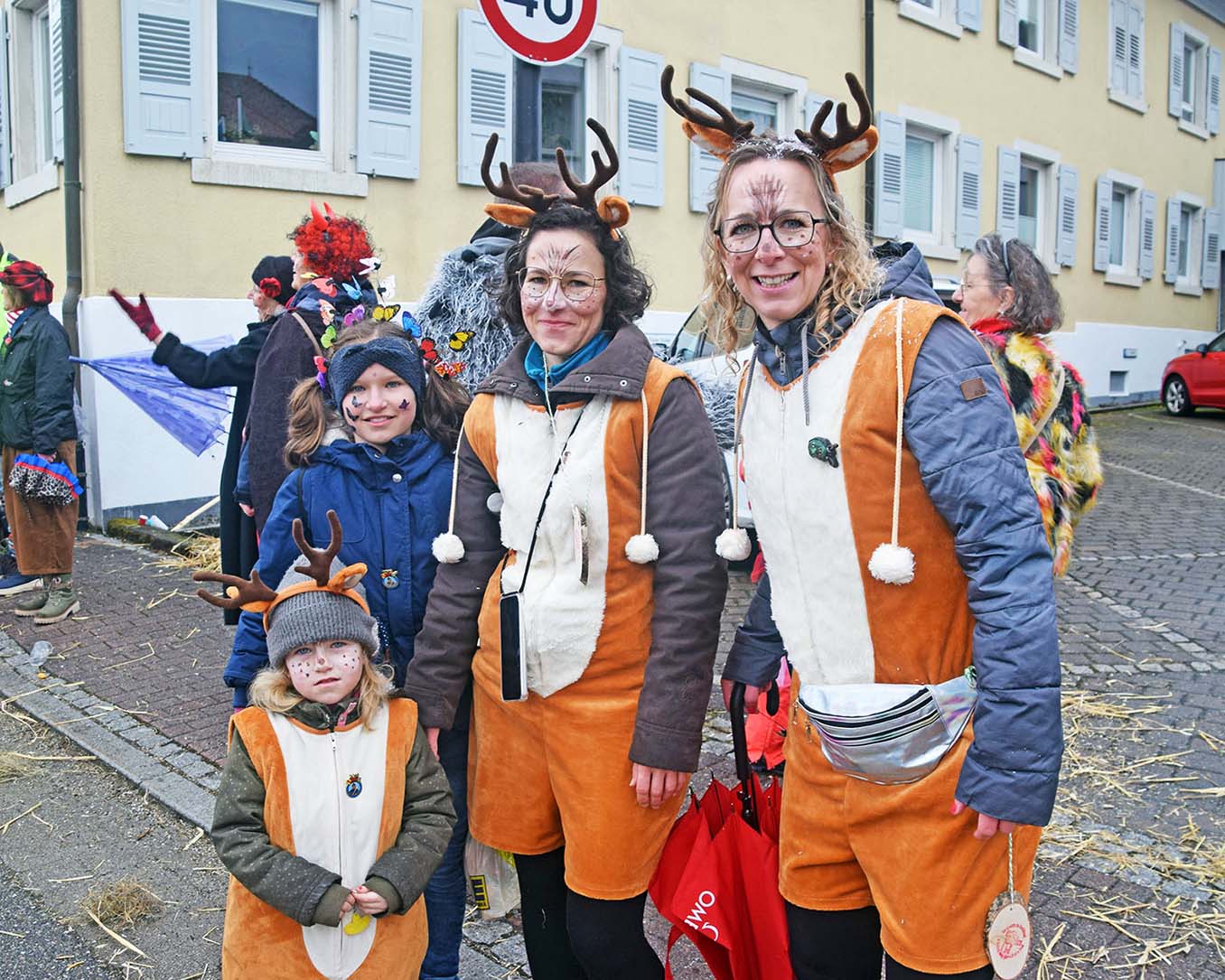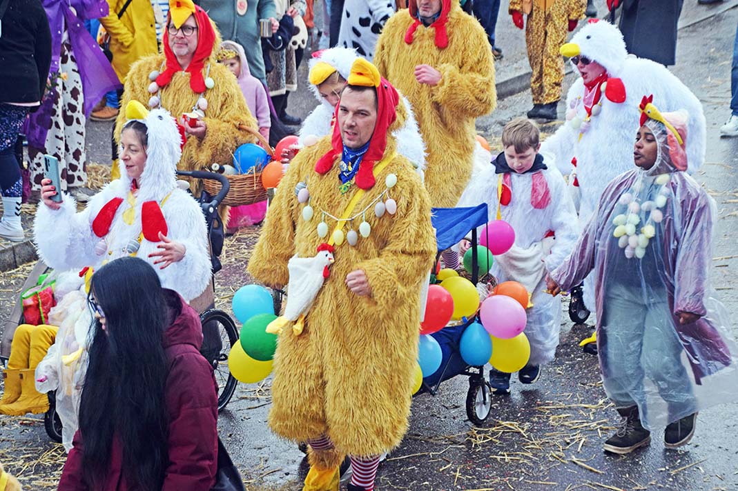 Eine weitere Nordracher Fasentgruppe, „Die Niegschmeckten“ nahm erstmals am Umzug teil. Sie wohnen im Neubaugebiet Grafenberg und stellten „wilde Hühner“ dar. Die Gleggle Hexen Biberach bildeten das Umzugsende.
