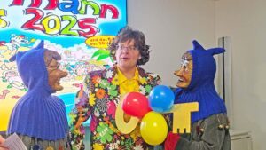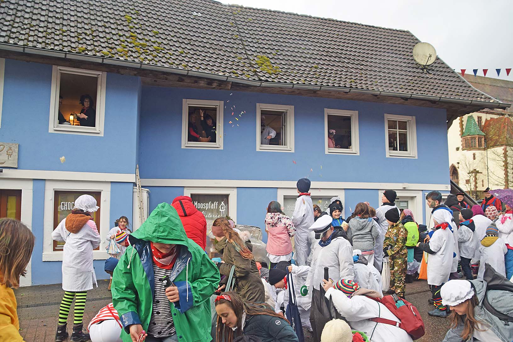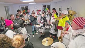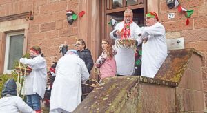 Narrenräte und Hemdglunkerkapelle führten den Umzug an. Erster Halt war nach wenigen Metern beim Pfarrhaus. Pfarrer Gerner verteilte mit Helfern Süßigkeiten an die Kinder. Ansgar Horsthemke hatte auch an die Erwachsenen gedacht und schenkte Likör aus. Weiter ging es talabwärts zu Schoko-L, wo es aus den Fenstern Süßigkeiten regnete. Dann hieß es, „vorwärts, wir gehen zurück“. Die Rathisler ließen ebenfalls reichlich Süßigkeiten von oben regnen. Die nächsten Stationen waren der Lebensmittelmarkt Herbrik und das Gasthaus zur Stube. Dann zog die bunte Schar weiter das Dorf hinauf und überall riefen die Kinder „gitzig, gitzig“ und wurden reichlich mit Gutsili und anderen Leckereien belohnt.