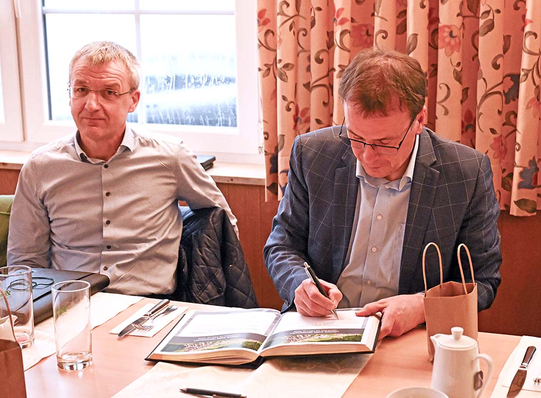 Europaabgeordneter Andreas Schwab und Staatssekretär Volker Schebesta diskutieren mit Nordracher Unternehmern. Eintrag ins goldene Buch der Gemeinde Nordrach.