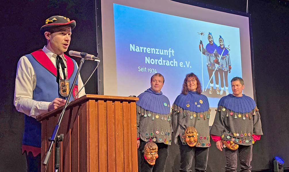 Zunftmeister Stefan Haas begrüßte in wohlgereimten Versen die närrischen Besucher in der Hansjakob-Halle. Dann bat er drei verdiente Zunftmitglieder zu sich. Claudius Welle und Clemens Bühler sind seit 25 Jahren aktiv, Susanne Schnurr seit 40 Jahren. Der Zunftmeister würdigte ihre Verdienste und überreichte ihnen eine Urkunde und ein Geschenk.