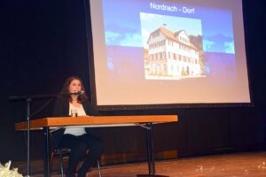 Zum Zunftabend gehört die Tagesschau. Miss Tagesschau ist seit vielen Jahren Katrin Götze. Mit klarer Sprache und wohl formulierten Texten, die immer ins Schwarze trafen, berichtete sie gewohnt seriös über 25 (!) – in Worten fünfundzwanzig – Nordracher Vorkommnisse, die auch im Bild gezeigt wurden.