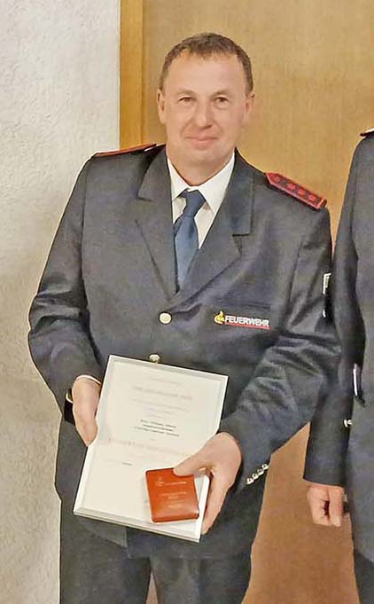 Ein verdienter Feuerwehrangehöriger konnte für 40-jährige aktive Dienstzeit ausgezeichnet werden. Kommandant Heiko Spinner war es eine Ehre, an Wolfgang Schwarz das Feuerwehr-Ehrenzeichen in Gold des Landes Baden-Württemberg zu überreichen. Wolfgang ist seit der Jugendfeuerwehr ein äußerst aktives und vorbildliches Mitglied der Nordracher Feuerwehr, seit vielen Jahren Atemschutzgeräteträger und bei Festen der Fahnenträger. Für ihn selbstverständlich ist die Teilnahme an Arbeitseinsätzen, zudem kümmert er sich um die Pflege der Außenanlagen am Feuerwehrgerätehaus. Auch die Kameradschaftspflege ist ihm immer wichtig, wozu er mit seiner Frau Maria oft schon mit Speis und Trank beigetragen hat.