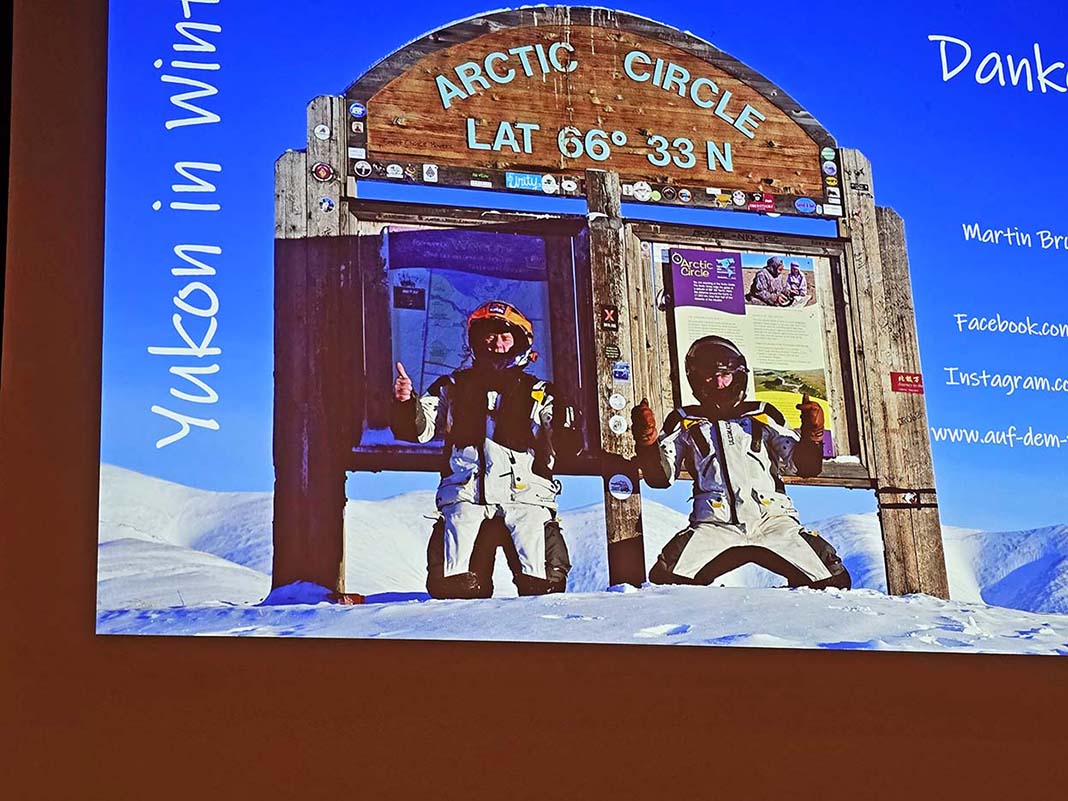 Die begeisterten Besucher erhielten viele interessante Informationen über die endlose Eis- und Schneewüste, wo sich trotz der lebensfeindlichen Umstände Tiere behaupten können. Martin Brucker fügte immer wieder besondere Erlebnisse ein. Vor allem die Schilderung der überwältigenden Gastfreundschaft der Einheimischen zog sich wie ein roter Faden durch seinen Bericht. Die Motorradextremreise war alles andere als ungefährlich. Davon zeugten auch kleinere Erfrierungen an Fingern und Zehen. Die Abenteurer trafen auch einen Schneepflugfahrer, der mit einem Kopfschütteln meinte, „You must be Germans! Wer sonst kommt auf die Idee, hier im Winter Motorrad zu fahren?“