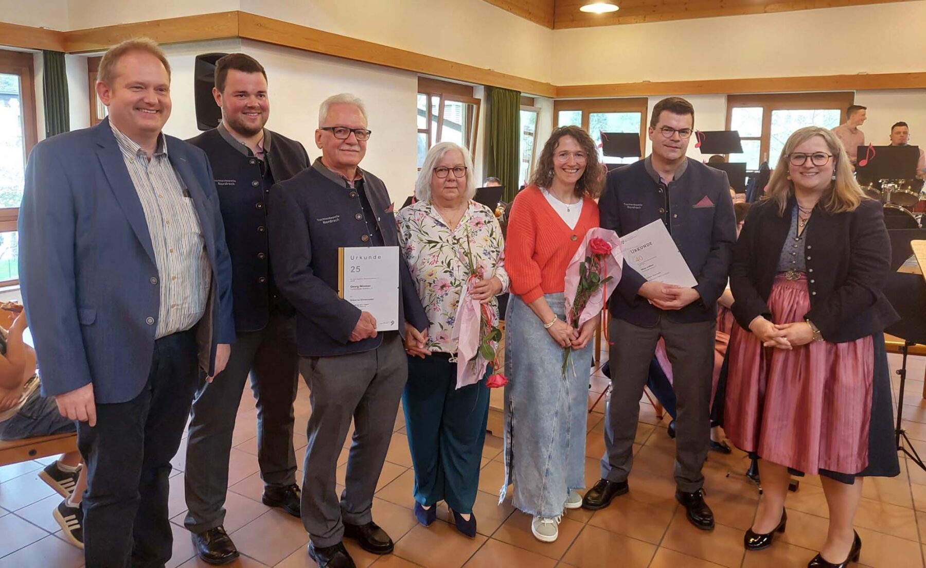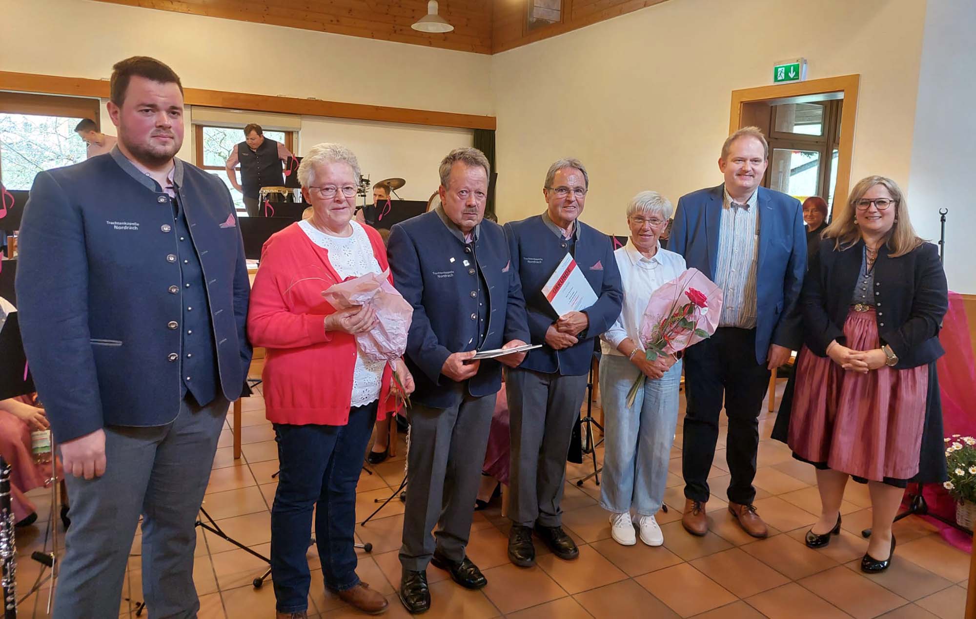 Die Jubilare wurden mit Ehrennadeln des Bundes Deutscher Blasmusikverbände ausgezeichnet: in Silber für 25 Jahre, in Gold für 40 Jahre und in Gold mit Kranz und Diamant für 60 Jahre Mitgliedschaft. Ergänzt wurden die Ehrungen durch Urkunden und persönliche Präsente der Kapelle. Auch die Partnerinnen der Geehrten wurden mit Blumen bedacht – als Zeichen des Dankes für ihre Unterstützung im Hintergrund.