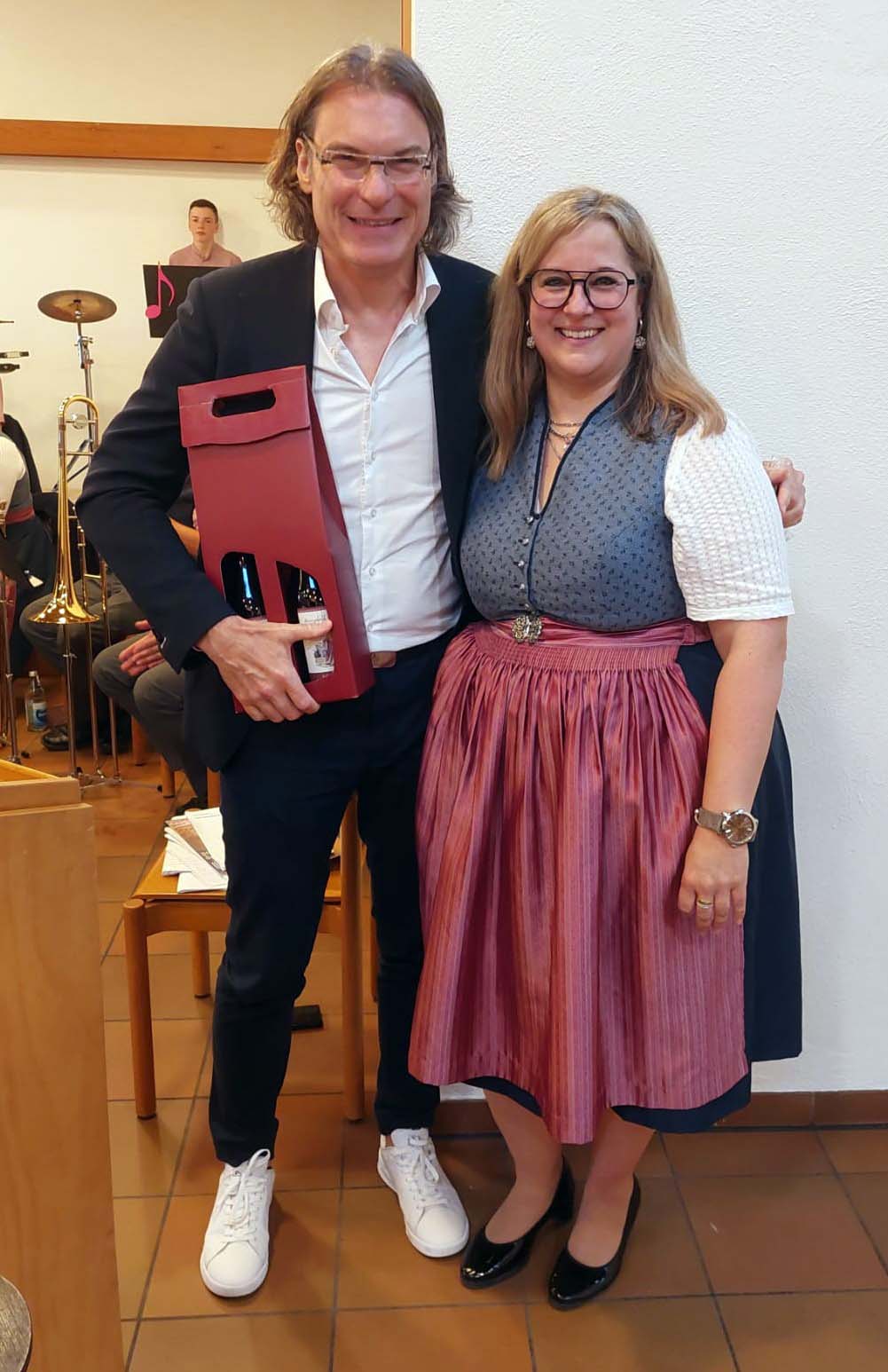 Im Anschluss richtete Melanie Junker erneut das Wort an das Publikum, um einen besonderen Dank auszusprechen. Sie würdigte die großzügige Unterstützung durch Dr. Dr. Thomas Helling und Michael Schnurr, die durch ihre Spenden die Anschaffung neuer Vereinskleidung ermöglicht hatten. Solch ein Engagement sei keineswegs selbstverständlich und zeige eine enge Verbundenheit zur Trachtenkapelle sowie zur Blasmusik insgesamt. Als Zeichen der Anerkennung wurden kleine Präsente überreicht.