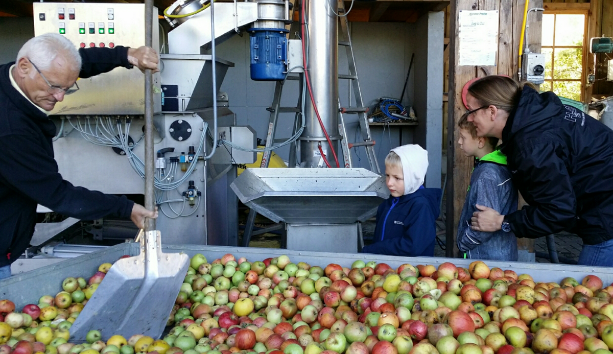Kleine und große Besucher erlebten bei ihrem Rundgang durch eine echte Trotterei, wie aus den Äpfeln der heimischen Streuobstwiesen in Minutenschnelle frischer, fruchtiger Apfelsaft gepresst wird. Der Saft wird auf Wunsch vieler Landwirte und Kleinerzeuger anschließend schonend erhitzt und vakuumverpackt. Die moderne Walzenpresse von Familie Schwendemann konnte im Rahmen des »Offenen Trottens« besichtigt werden.