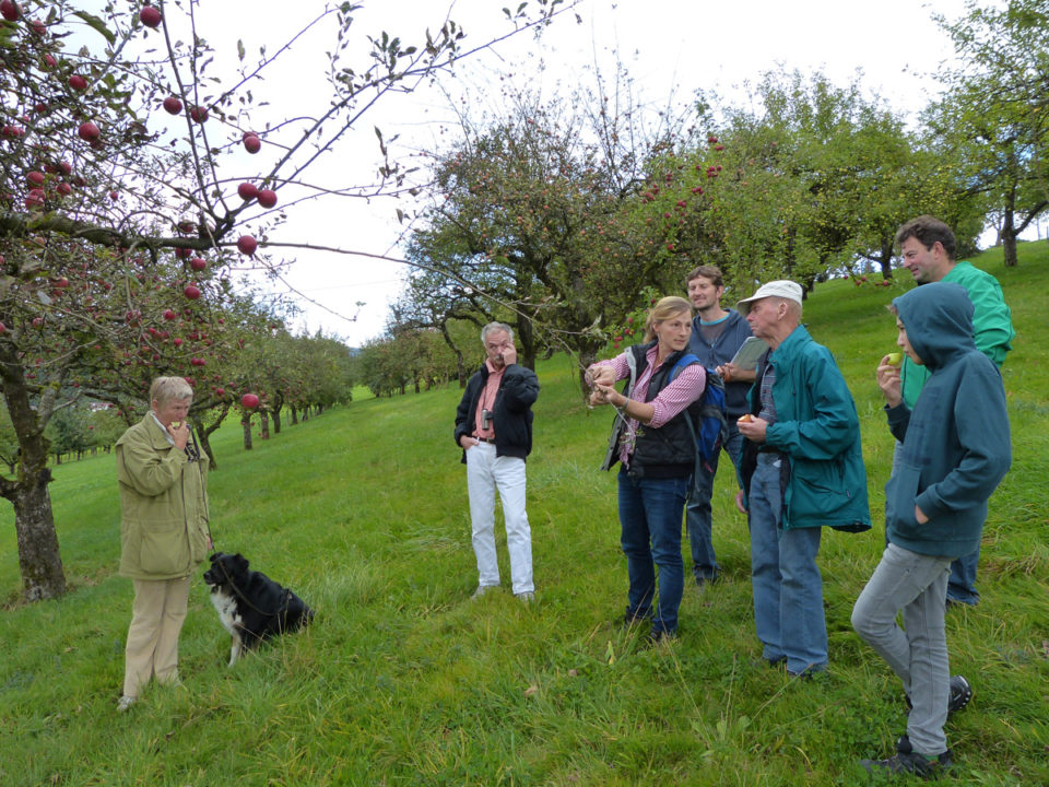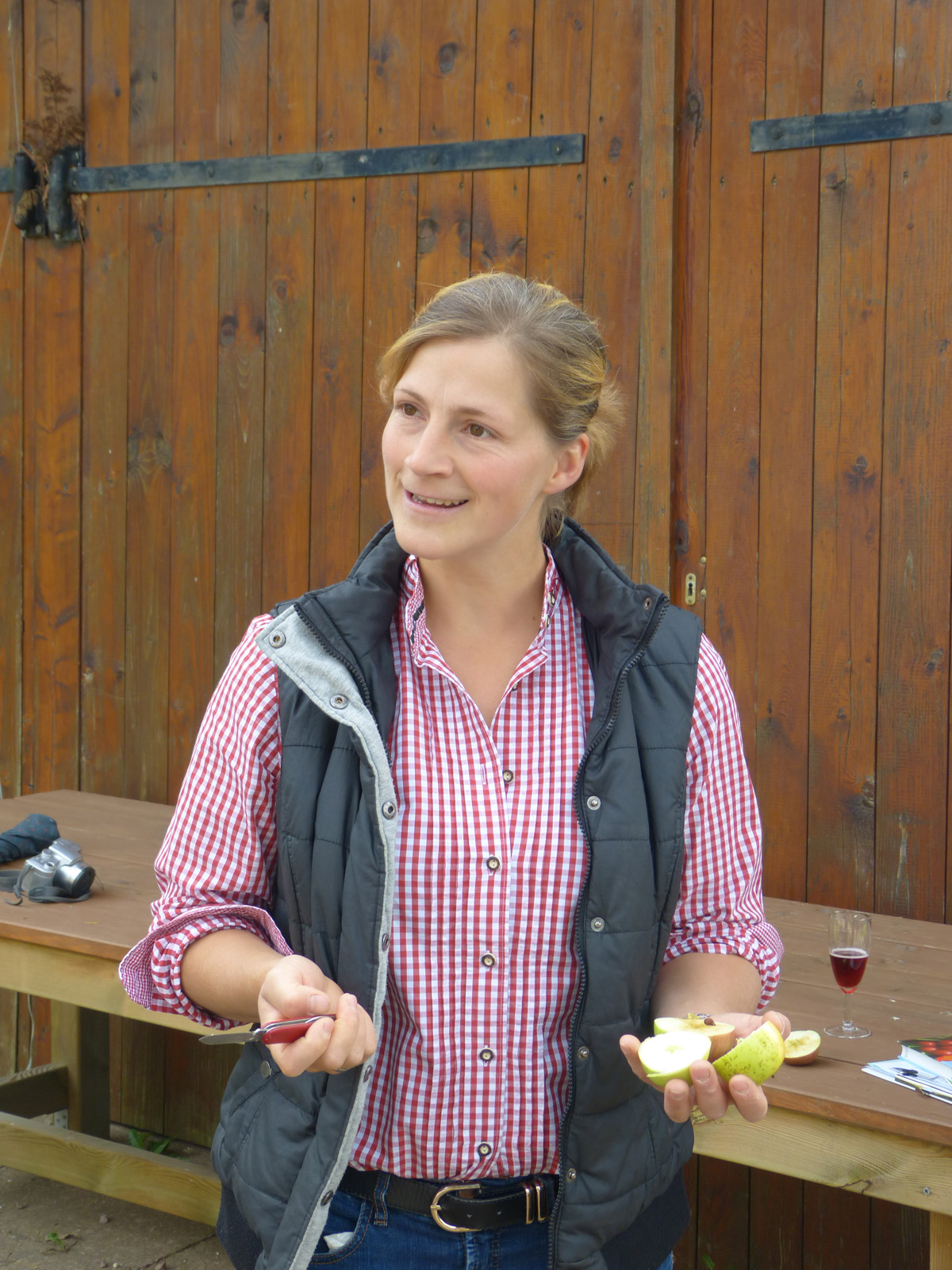 Auch Themen wie Pflanzenschutz, Sorten- und Reifebestimmung erläutert Pfundstein am lebenden Objekt. Wobei die Frage nach dem Reifegrad derzeit eine hoch aktuelle ist, denn die Erntezeit erstreckt sich je nach Sorte von Juli bis in den November hinein. »Reif ist ein Apfel eigentlich, wenn ich reinbeiße und er schmeckt einigermaßen, d.h. er muss einigermaßen Zucker haben«, erläutert die Apfelkennerin. Auch braune Kerne sind ein Zeichen der Reife. Ein weiteres Kennzeichen: Wenn man die Frucht sehr leicht vom Baum abdrehen kann. »Hormonell gesteuert bildet sich während der Reife eine Trennschicht an der Sollbruchstelle. Fällt der Apfel von alleine runter, dann ist er also reif. »Dann kann man ihn aufsammeln für Apfelsaft oder Apfelwein«, so Pfundstein, denn für diese Verwendungszwecke »ist es nur wichtig, dass der Apfel Öchsle hat, also Zucker.«