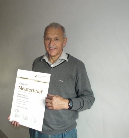 Vor 40 Jahren legte Walter Kasper die Meisterprüfung im Schreinerhandwerk ab. Für seine berufliche Lebensleistung wurde er nun von der Handwerkskammer Freiburg mit dem goldenen Meisterbrief ausgezeichnet.