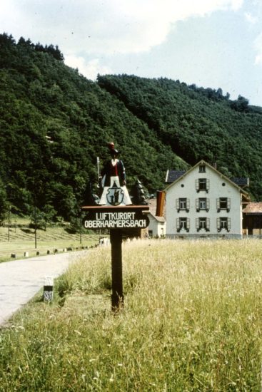 Fronleichnam 1956: Die Häuser sind beflaggt und geziert, wie das Haus Barth (»‘s Accisors«, das heutige Gasthaus »Hubertus«). Schlichte hölzerne Figuren an den Ortseingängen (die eine kurz nach der Einmündung ins Jedensbachtal, die andere im Obertal beim Haus Killig) hießen damals die Gäste im Urlaubsort Oberharmersbach willkommen. Die Gemeinde warb damals mit einem Symbol der Tradition und des Brauchtums, schließlich stand und steht die Historische Bürgerwehr für die Verbindung von Vergangenheit und Gegenwart.