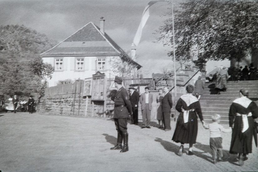 Im Hintergrund ist das damalige Schwesternhaus zu sehen (ehemals bis 1922 Pfarrhaus). Dieses Gebäude wich 1973 dem Neubau der Volksbank, die damit gerade auf die andere Straßenseite umzog. Hier waren im Erdgeschoss ein Krankenzimmer untergebracht (Schwester Seraphia und ihre Nachfolgerin Schwester Gottwina halfen bei kleinen medizinischen Notfällen), im Obergeschoss eine Nähschule mit einem großen Raum, in dem auch mitunter Schwester Reineldis Harmoniumunterricht gab. Hin und wieder wurden hier auch Theaterstücke eingeübt.