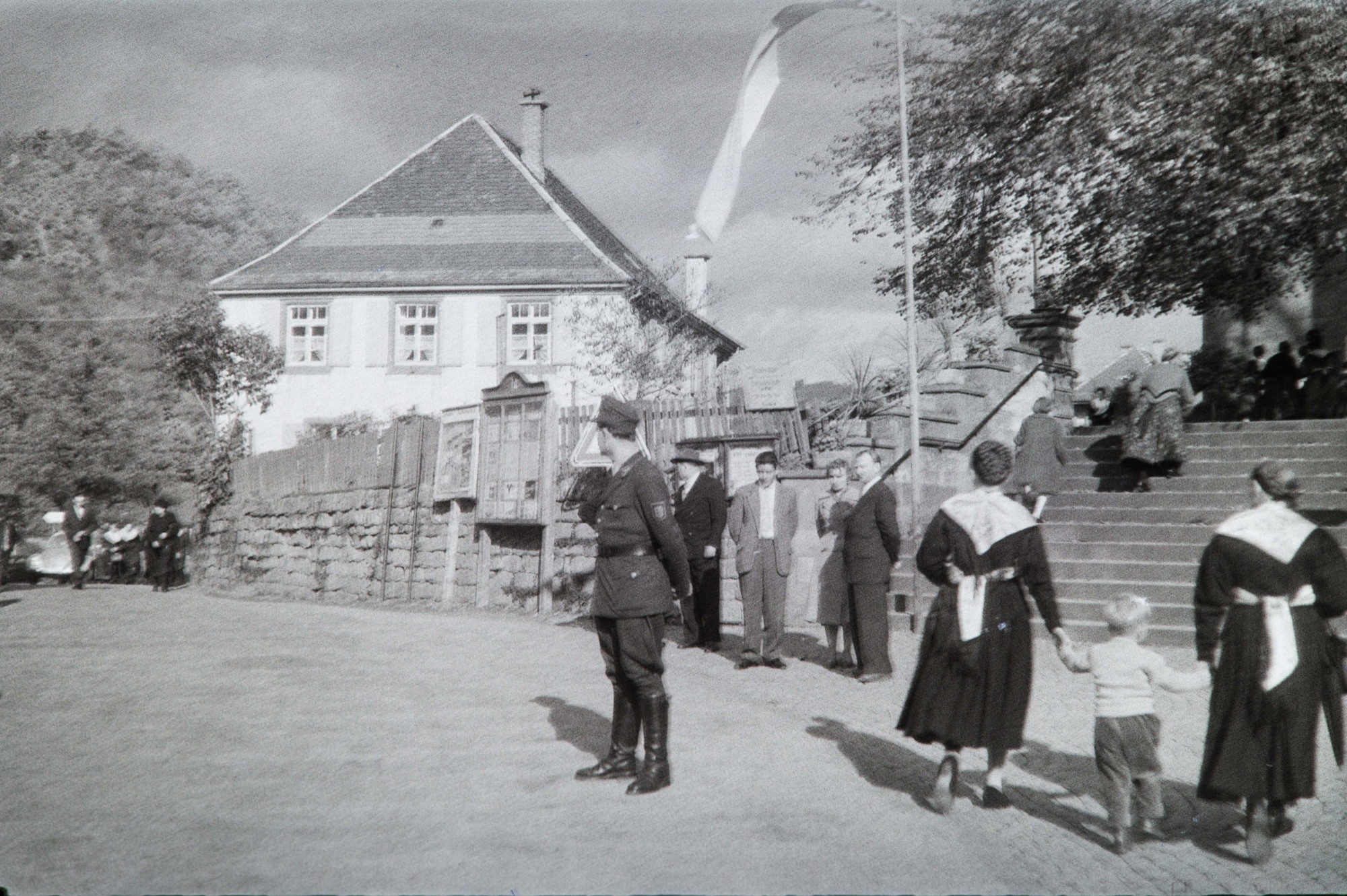 Lösung: Das Bild zeigt einen ganz »normalen« Sonntagnachmittag in den 1950er Jahren. Die Oberharmersbacher eilen über die große Kirchentreppe zur »Vesper«. Tracht war damals bei den Frauen nicht nur an Festtagen durchaus noch üblich.