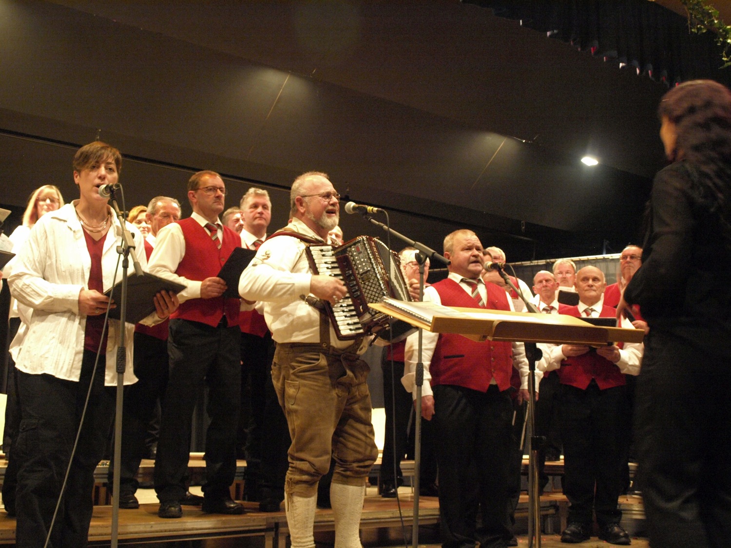 Alpenländisch-rustikal wurde es zum Schluss. Alfons Isenmann betrat mit Akkordeon und Lederhose die Bühne und begleitete den Chor bei »Der Jodelautomat« von den Schürzenjägern und Hubert von Goiserns »Koa Hiatamadl«. Dabei konnten Ulrike Sigl und Helmut Hug ihr Jodeltalent unter Beweis stellen. Einfühlsam wurden die Liedvorträge abwechselnd durch Instrumentalisten begleitet: Adrian Sieferle und David Blasen (Klavier), Bernhard Lehmann (Keyboard), Maxi Albert, Stefanie Lehmann, Tobias Lehmann (Gitarren und Bass) sowie Benedikt Schwendemann (Schlagzeug). Mit viel Beifall quittierten die Zuhörer am Schluss den Auftritt der Sängerinnen und Sänger, die gerne die stürmisch geforderten Zugaben »Kriminaltango« und »Träume sind stärker« gewährten.