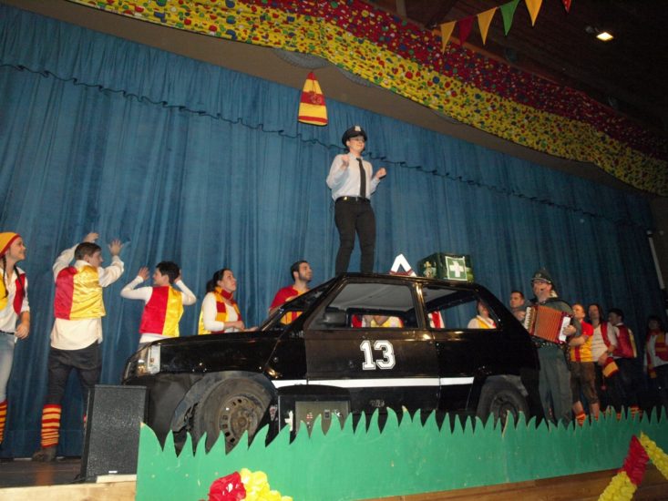 Foto: Hermann KornmayerWo bleiben denn nur die Narren, fragte man sich zu Beginn in Erwartung des obligatorischen Einmarsches. Stattdessen stand ein klappriger Kleinwagen auf der Bühne, der von der Polizei kontrolliert wurde. Ein roter Damenschlüpfer als Warndreieck und ein Bierkasten für das Verbandsmaterial wurden großzügig in Ordnung befunden. Nicht schlecht staunten die Beamten, dass nach und nach rund 20 Personen im Dörfle-Narrenkleid aus dem Wagen krochen. »Hocke die alli im Aschenbecher?«, meinte einer von ihnen. Beim anschließend durchgeführten Massen-Alkoholtest sollte mindestens die Hälfte festgenommen werden. Doch die Narren protestierten, denn »wir müssen auf den Dörfle-Ball!« Also ließ man sie laufen und der Abend war zur Freude des Publikums gerettet.