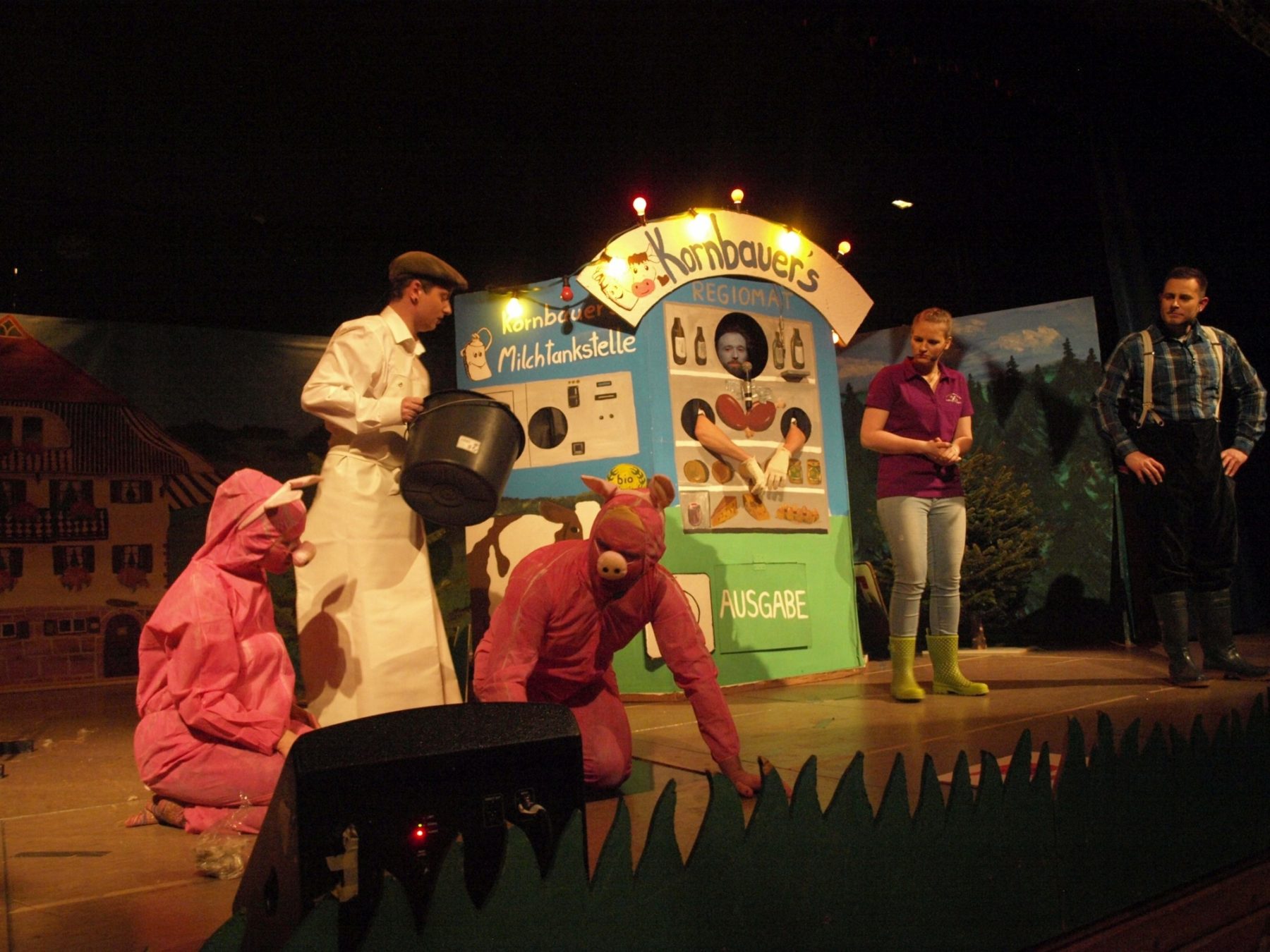 Das Obertal war die erste Station im närrischen Programm, denn »in unsrem Dörfle isch immer was los.« Dort hat der geschäftstüchtige Kornbauer einen Selbstbedienungsautomaten aufgestellt, »zum Wohl des Tales und der Region«, wie der Besitzer stolz verkündete. Diese Einrichtung inspirierte die Narren natürlich zu den verrücktesten Ideen. Nach ihren Vorstellungen gibt es hier nicht nur Milch und andere Produkte frisch vom Hof zu kaufen, der Automat, ausgestattet mit Sprach- und Gesichtserkennung, bietet alles für den täglichen Bedarf, sogar Kondome. Selbst Krankmeldungen spuckt das Gerät auf Knopfdruck aus. Diesen Service nutzten zwei arme Schweine, denen der Metzger an den Kragen wollte. Und wenn demnächst die Sparkasse ihre Filiale dicht macht, dann kann man hier sein Geld bekommen. Allerdings kassiert der Bauer dann 20 Prozent Provision. Die Spracherkennung hatte aber ihre Macken, was einen Kurgast verzweifeln ließ. Erst ein Einheimischer mit »Roßbe-Dialekt« konnte ihm helfen.