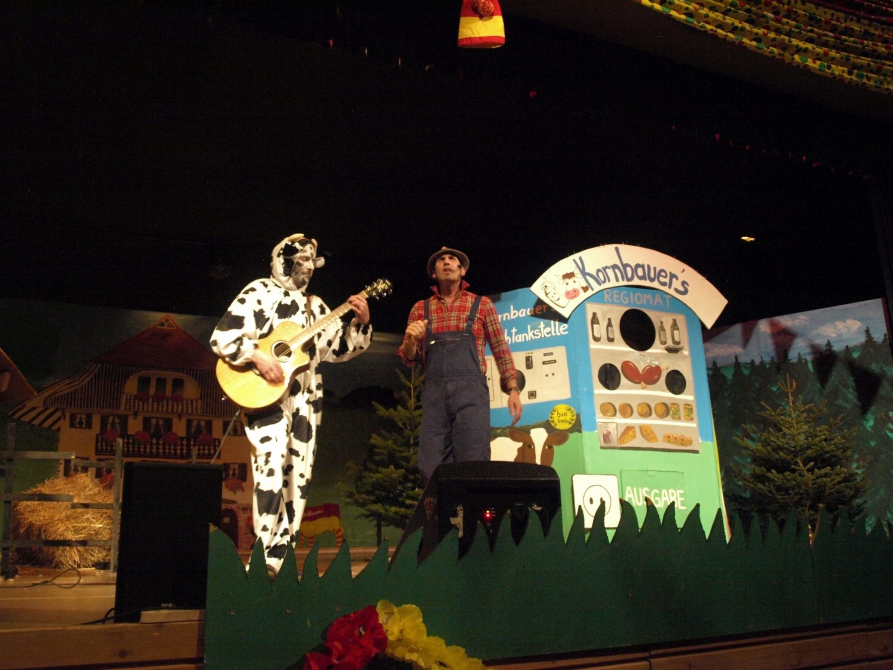 In der wunderschönen Kulisse mit dem Bild des Hofes im Hintergrund stimmten Volker Schwarz und Marius Baumann (Gitarre) ihre Lieder zum Mu(h)sical »Stefan und die Kuh« an. Die tolle Gesangsnummer war dem Kornbur gewidmet und endete mit dem Loblied auf die »Knack-Knack-Knackwurst vom Metzger-Karli«.
