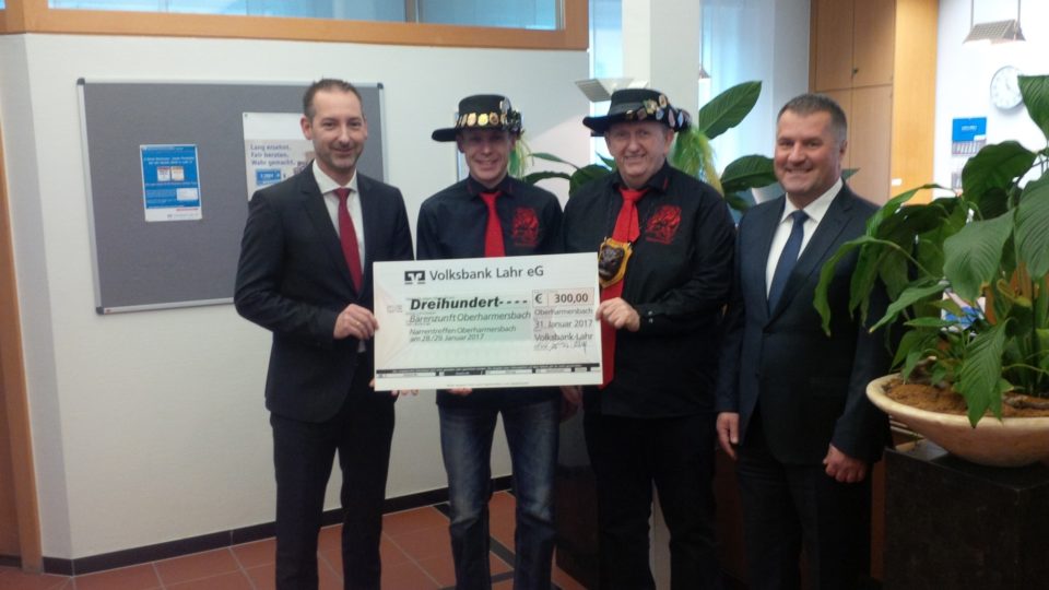 Anlässlich des 44-jährigen Jubiläums der Bärenzunft Oberharmersbach hat die Volksbank Lahr eine Spende von 300 Euro übergeben.