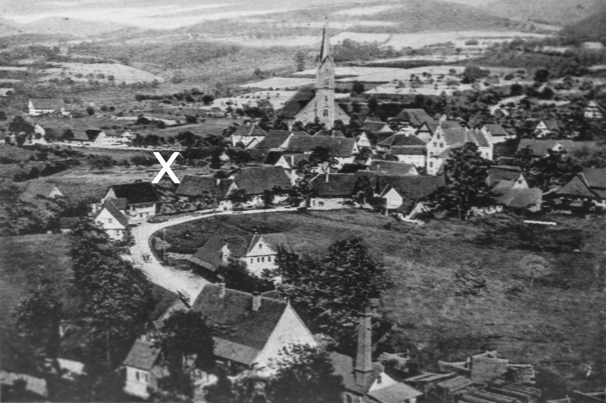 Lösung: Unser Bild zeigt die wohl älteste Aufnahme des Dorfes. Das Bild lässt sich ziemlich genau datieren. Das Rathaus ist bereits fertig gestellt (1901), aber, wie unschwer zu erkennen ist, fehlt die Bahnlinie (1904 eröffnet) und damit natürlich auch der Bahnhof »Dorf« und die Bahnhofswirtschaft, das spätere Gasthaus »Schwarzwälder Hof«. Das Bild ist also 1902/1903 entstanden.