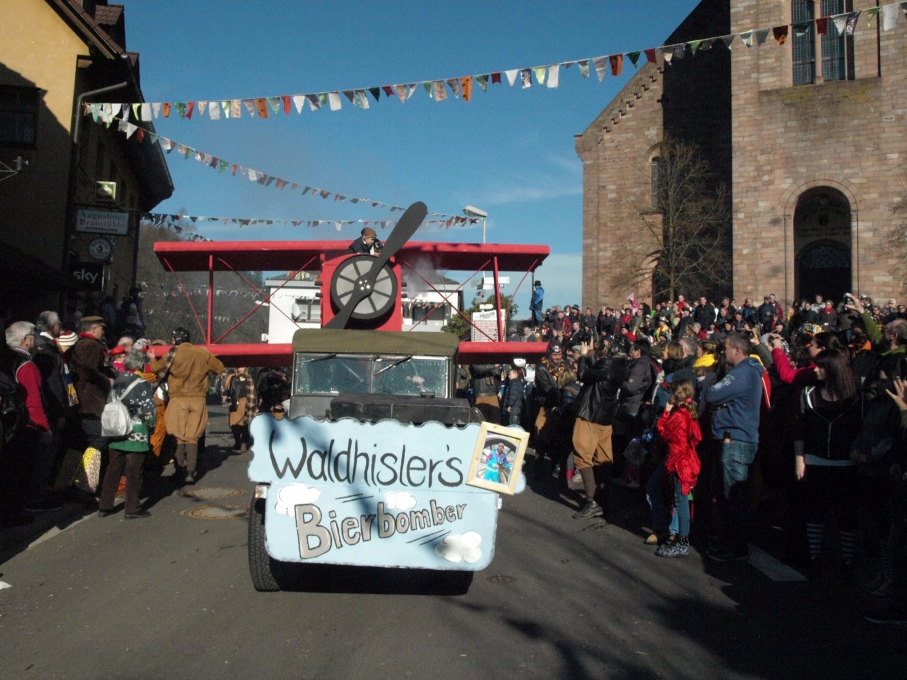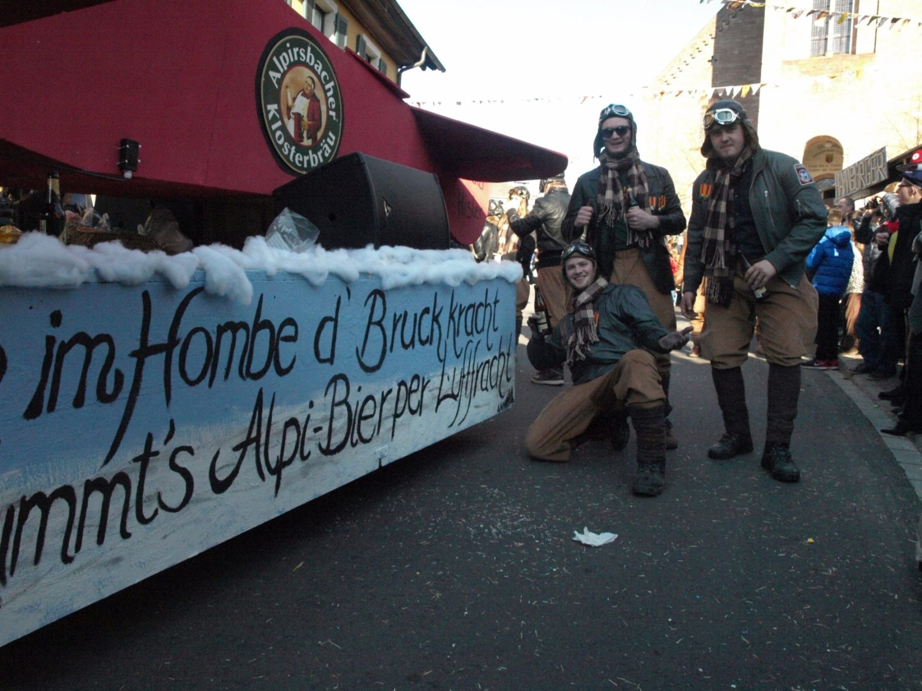 Die »Waldhäuser« hatten sich »als tollkühne Männer in ihren fliegenden Kisten« kostümiert, landeten mit ihrem »Bierbomber« mitten im Fasentgeschehen und hatten Mühe, ihren Doppeldecker unbeschadet ins Ziel zu bringen. Die Narren aus dem Harmersbacher Seitental dachten bei ihrem Motiv an die zukünftige Sanierung der L94 und reimten: »Isch im Hombe d‘ Bruck kracht, kummt’s Alpi-Bier per Luftfracht.«