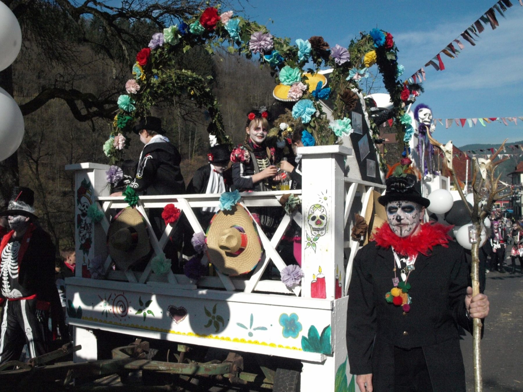 Den farbenfrohen Umzug, sachkundig kommentiert von Häsvogt Claus Franke und Zunftrat Joachim Albrecht, bereicherten die Sieger des Preismaskenballs, die »Huebacher Hexewiibli«, die Quellengeister aus Bad Peterstal, die Hofstettener Alt-Steig-Hexen, die lustigen Prinzbacher und manche »wilde« Fußgruppe. Für die närrischen Klänge zum Mitklatschen und Schunkeln sorgten der Spielmannszug der Bürgerwehr sowie die Miliz- und Trachtenkapelle. Nach dem Umzug wurde dann von Narren und Gästen in den Gasthäusern und auf der Straße in der abgesperrten Dorfmitte die Fasent gefeiert. Nach so viel Vergangenheit und Zukunft genoss man gemeinsam die pure Gegenwart.
