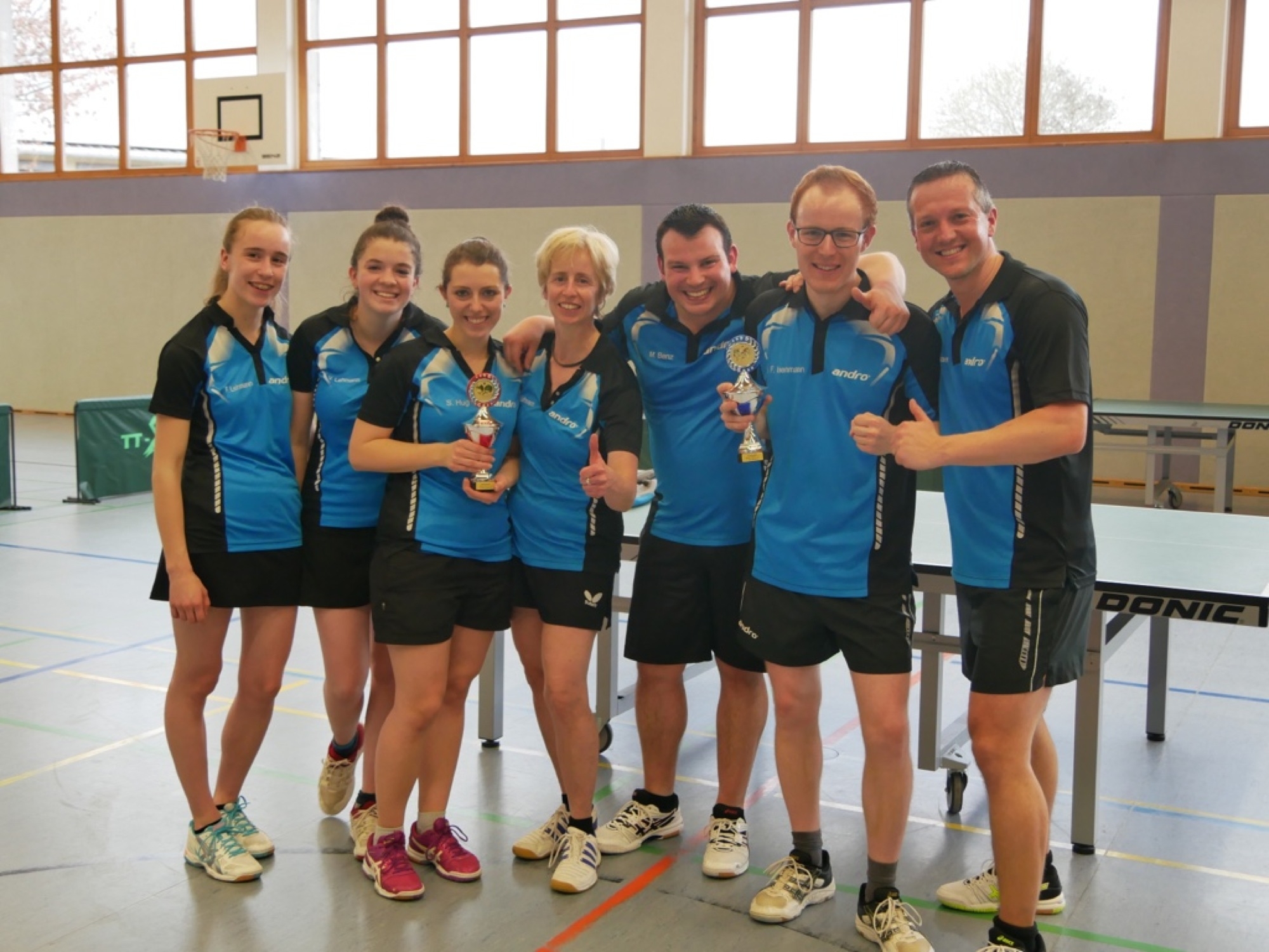 Zwei Mannschaften der DJK gelang es am Wochenende in Hohberg den Titel des Be­zirks­pokalsiegers zu erringen. Dies gelang sowohl den Damen 1, die sich im Wettbewerb Damen B mit 4:2 gegen Willstätt 2 durchsetzen, als auch den Herren 2, die im Wettbewerb Herren C gegen Schmieheim mit 4:3 knapp die Oberhand behielten. Für beide Teams geht es nun am 23. April zum südbadischen Pokalfinale nach Haslach, wo man sich gegen die anderen fünf Bezirkspokalsieger aus Südbaden behaupten will. Für die DJK spielten (von links): Felicitas Lehmann, Vanessa Lehmann, Stefanie Hug, Antonia Lehmann, Marcel Benz, Fabian Isenmann und Marco Lehmann.