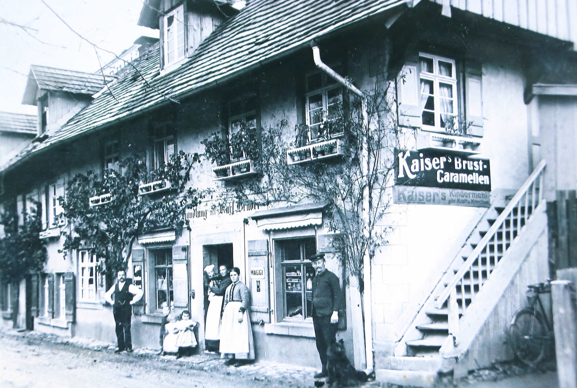 Lösung: Das Bild erinnert an die Zeit, als in Oberharmersbach der Einzelhandel noch eine gewichtige Rolle spielte. Abgebildet ist die Handlung Bruder (über der Ladentür steht: Handlung von Karl Bruder) wenige Jahre nach 1900. Vor dem Geschäft stehen wohl Mitglieder der Familie Bruder und Kinder der benachbarten Familie Brucher (»’s Schninders«). Die größeren Schaufenster des Lebensmittelgeschäfts wurden Mitte der 1950er Jahre eingebaut, die Holztreppe wich ungefähr zu selben Zeit einem Anbau.