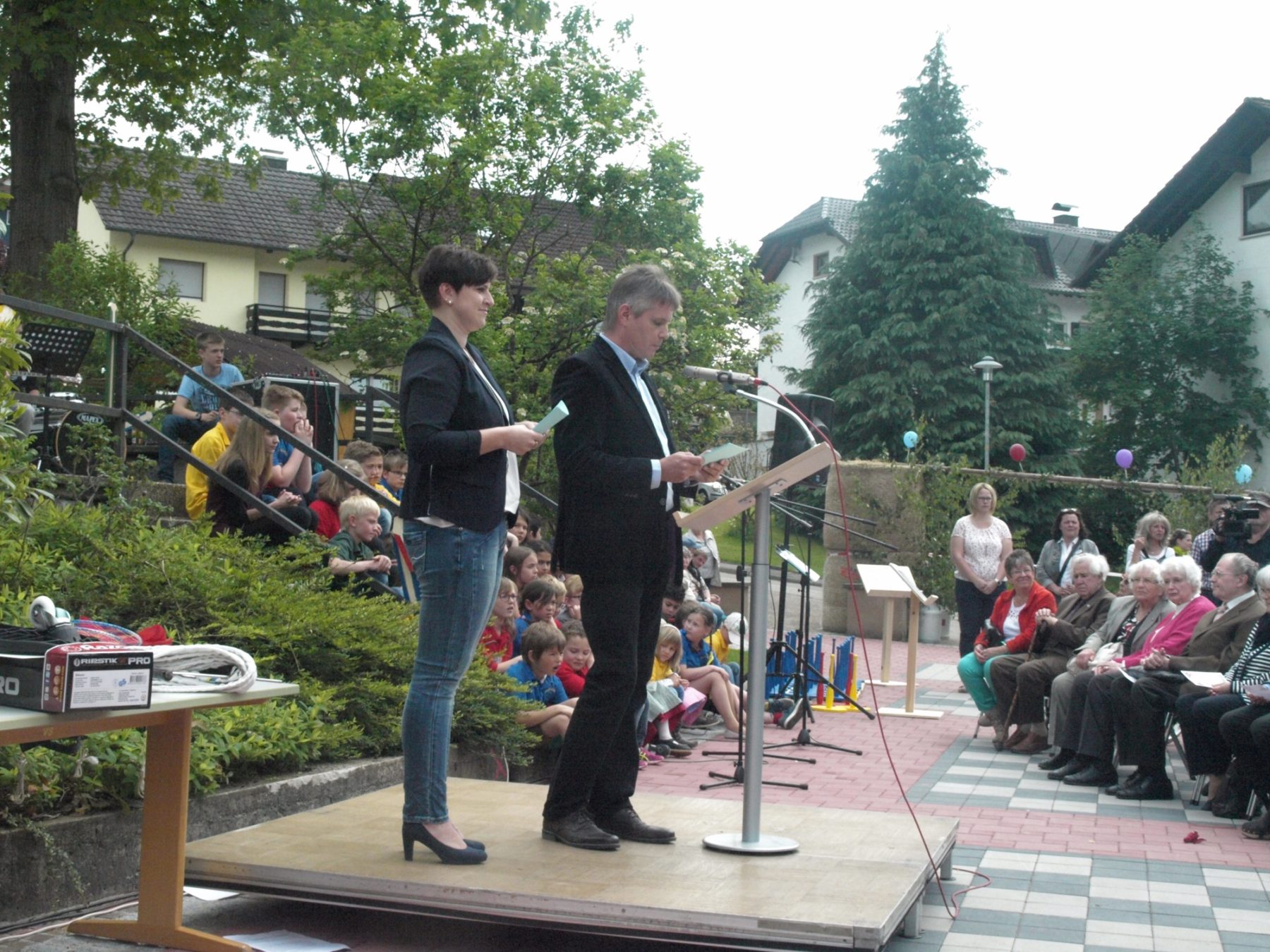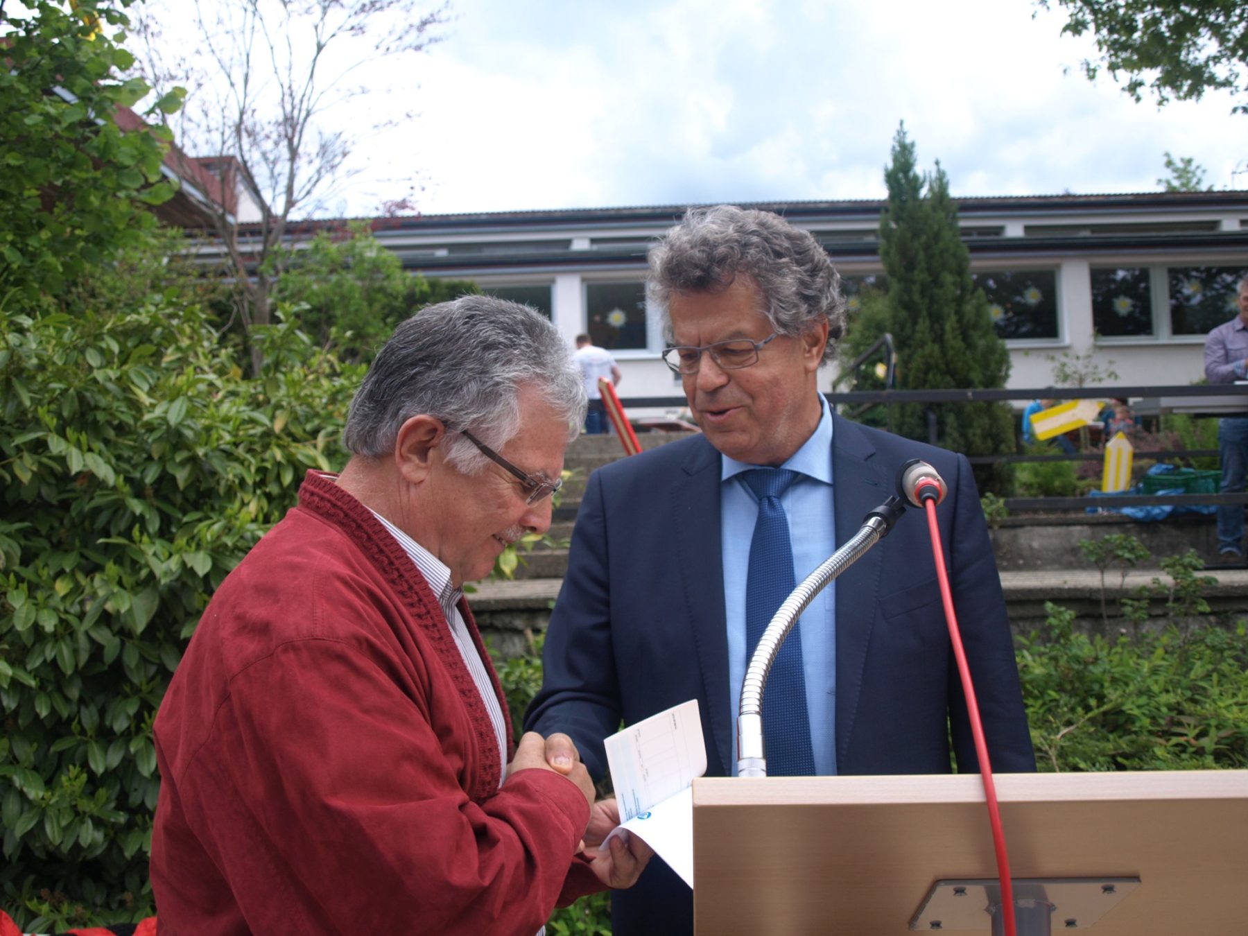 Grußworte und Glückwünsche überbrachten auch Elternbeiratsvorsitzender Claus Franke und Franz Lechleiter für den Förderverein, der neben zwei Waveboards eine großzügige Spende von 5.000 Euro überreichte. »Hier wird in die Zukunft investiert, was die Firma Junker unterstützen will«, sagte Geschäftsführer Rochus Mayer und übergab zur Freude von Schule und Schulträger den stolzen Betrag von 15000 Euro an den Förderverein der Schule.