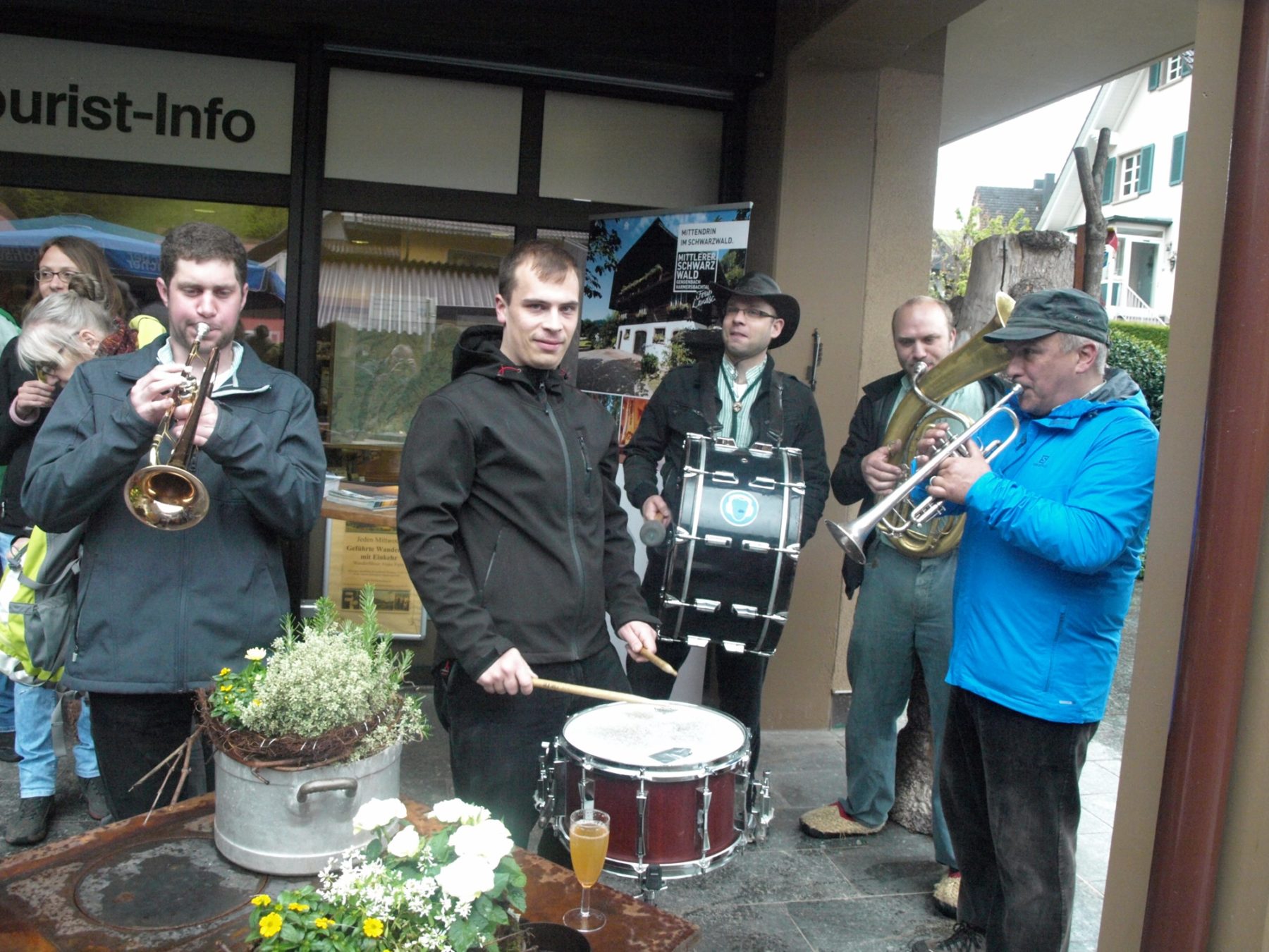 Musik erwartete die Wanderschar in den Vesperstuben Langenberg, Harkhof und bei der Kreuzsattelhütte. Organisiert von Jill Löffler sorgten die »Bla-Bli-Bla-Blasmusik«, die Akkordeonspieler Alfons Isenmann und Meinrad Jilg sowie Paul Boschert mit seinem Alphorn für Unterhaltung. Wer nicht so gut zu Fuß war, der konnte sich mit einem Shuttle-Bus von der Reichstalhalle zum Harkhof und wieder zurückfahren
