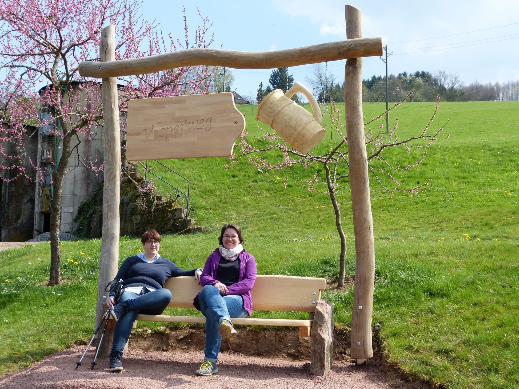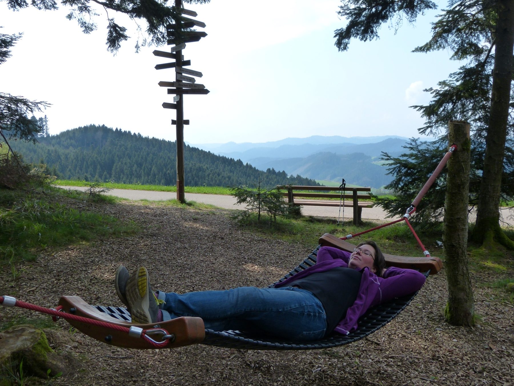 Es ist sicherlich nicht ganz leicht, sich von diesem besonderen Ort loszureißen, doch auch der nächste Wegabschnitt auf den Langenberg hat mit der »Baumwiege mit Durchblick« und dem »Pano[rahmen]« zwei außergewöhnliche Rastplätze zu bieten. Während die Baumwiege zu einem kurzen Nickerchen verführt, wird der Bilderrahmen für eine Fotosession genutzt.