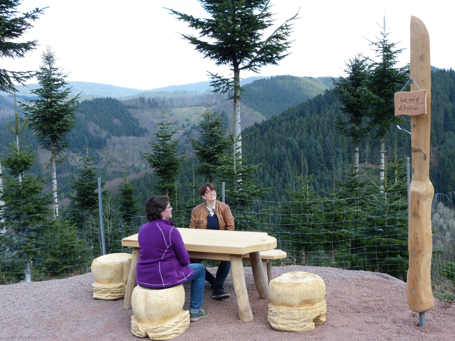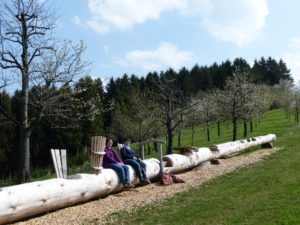 Vor dem Anwesen weisen eine Bank mit Vesperbrett und Mostkrug auf den Beginn des Weges hin. Wir folgen der Beschilderung in Richtung Hubhof, wo ein Brunnenhisli mit Erfrischungen auf uns wartet. Weiter geht es zu einem der vielen Höhepunkte entlang des Weges. In einen 30 Meter langen Baumstamm wurden verschiedene Sitzmöglichkeiten eingearbeitet, sodass hier nicht nur die Aussicht ins Tal, sondern auch die erste Stärkung genossen werden kann.