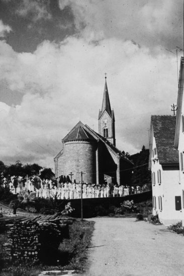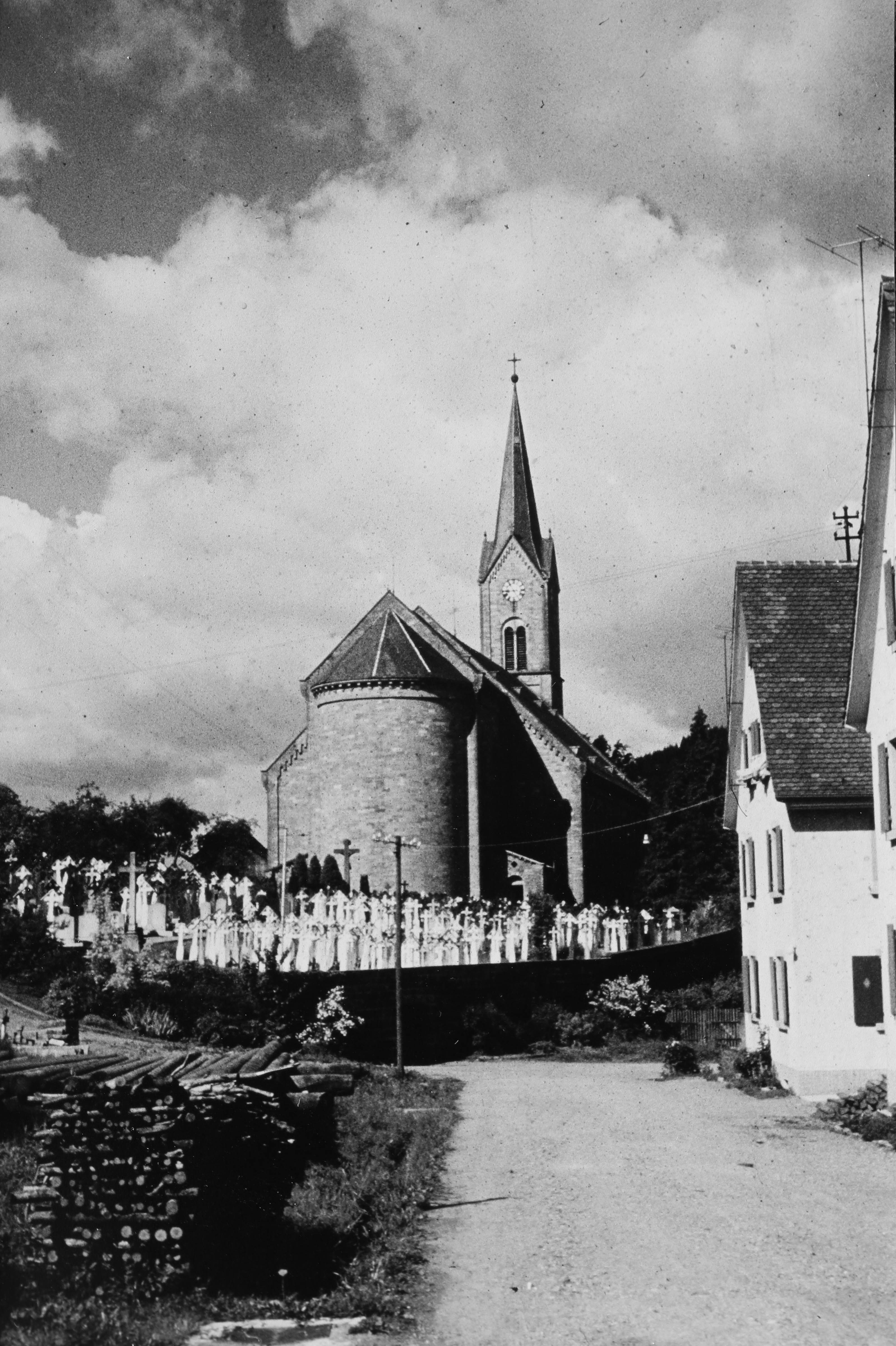 Lösung: Das Bild wurde in den späten 1950er Jahren vom Kirchweg aus aufgenommen. Die Pfarrkirche besitzt noch die alte (kleinere Sakristei), die unter Pfarrer Franz Forner vergrößert wurde, auch um die hohen Stufen von der Sakristei zum Altarraum zu beseitigen.