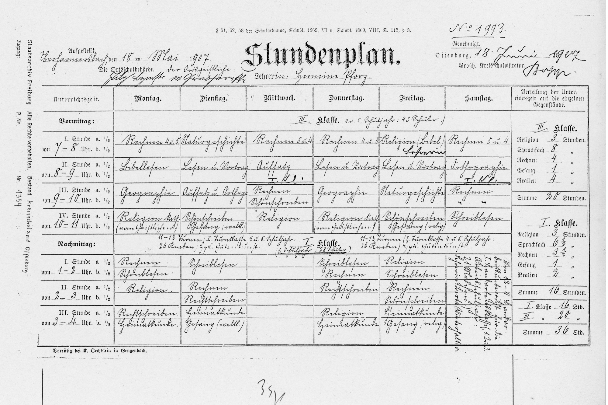 Lösung: Unser Bild zeigt einen Stundenplan aus dem Jahre 1907 (aufgestellt am 18. Mai; genehmigt am 18. Juni: das Schuljahr begann damals noch im April jeweils nach den Osterferien) und spiegelt den damaligen Schulalltag der Schülerinnen und Schüler in der Volksschule Dorf wider. Abgezeichnet und genehmigt ist der Stundenplan von der Ortsschulbehörde (links oben), verkörpert durch den amtierenden Bürgermeister (zu jener Zeit Landolin Jilg) und den jeweiligen Pfarrer (damals Sittikus Grabherr). Bestätigt wurde der Verwaltungsakt vom Kreisschulvisitator Rapp. Es unterrichtete im Jahre 1907 im Dorf die Lehrerin Hermine Pforz.
