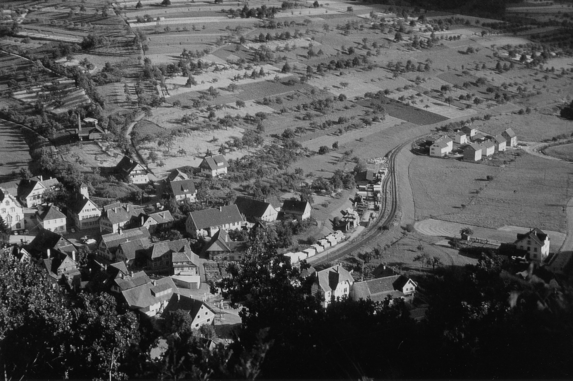 Der Bahnhof Dorf weist noch ein Rangiergleis auf, das aber schon in den 1970-er Jahren still gelegt worden war. Links oberhalb davon sind die Bretterstapel des Sägewerks Wilhelm Lehmann zu sehen (mittendrin ein Schuppen, in dem die Firma Kasper Kohlen/Briketts gelagert hatte, am Ende der Bretterstapel eine offene Halle des Sägewerks). Bei der Weiche für das Rangiergleis sieht man links noch eine der damals üblichen »wilden« Müllkippen, die in den 1960-er Jahren mit einer geregelten Müllabfuhr geschlossen wurden.