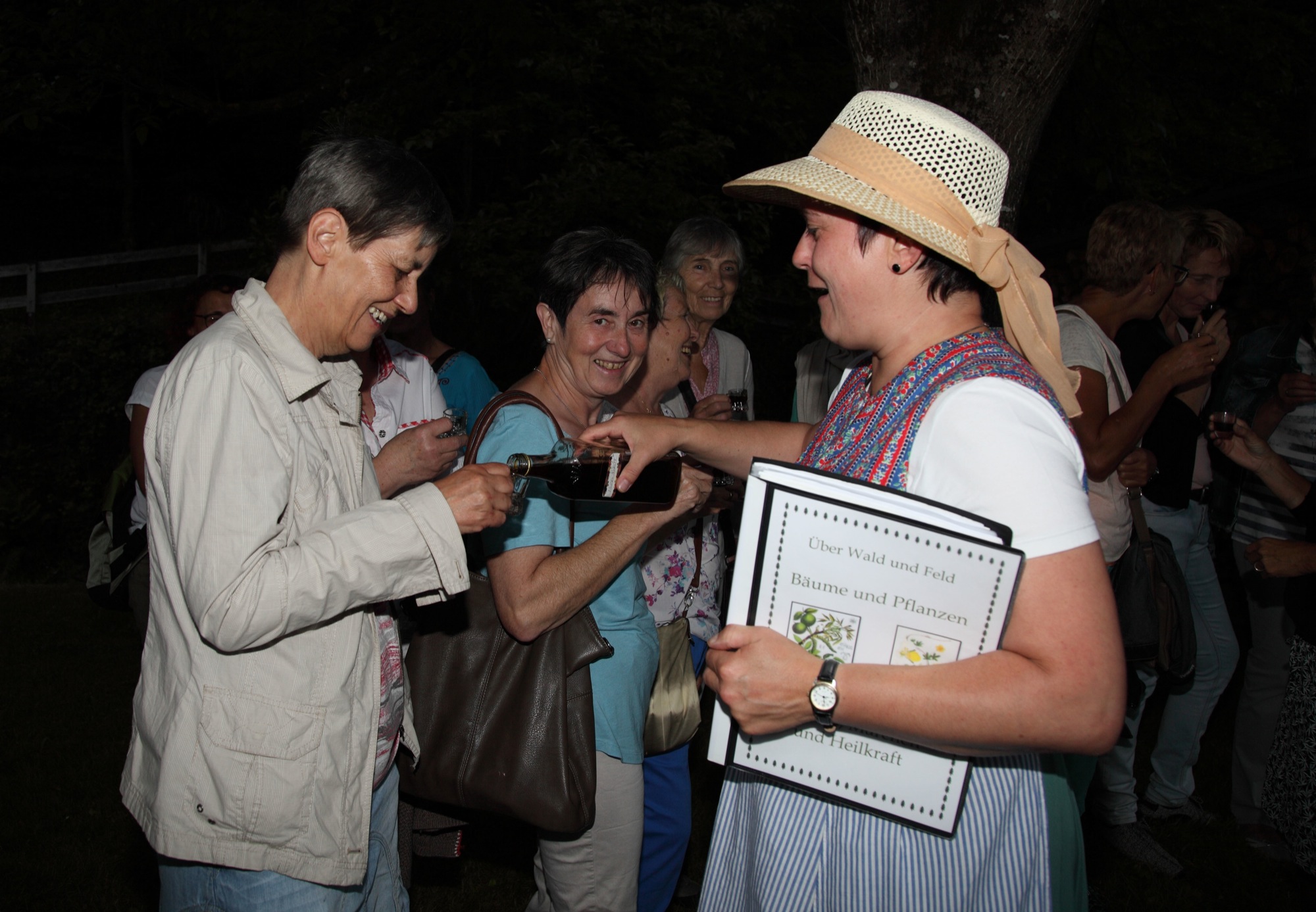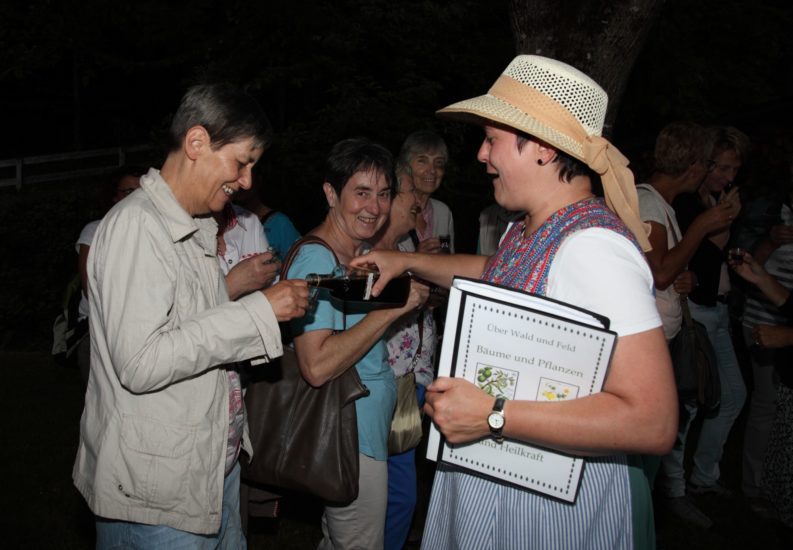 Zwischendurch bietet Michaela auch mal ein »Versucherle« an, auch mal ganz gewöhnlicher Birkensaft aus dem Tetra-Pack. Eine ganze Litanei von Wirkstoffen, die aus Blättern, bestimmten Säften und aus der Rinde verschiedener Pflanzen und Bäumen gewonnen werden, weiß sie aufzuzählen. Der Rothklee soll gegen Keuchhusten und bei Bronchitis helfen. Und wieder darf jeder probieren, wie Rotklee schmecken kann, »wenn er mit Korn angesetzt und mit Cognac verfeinert ist« ergänzt Michaela.