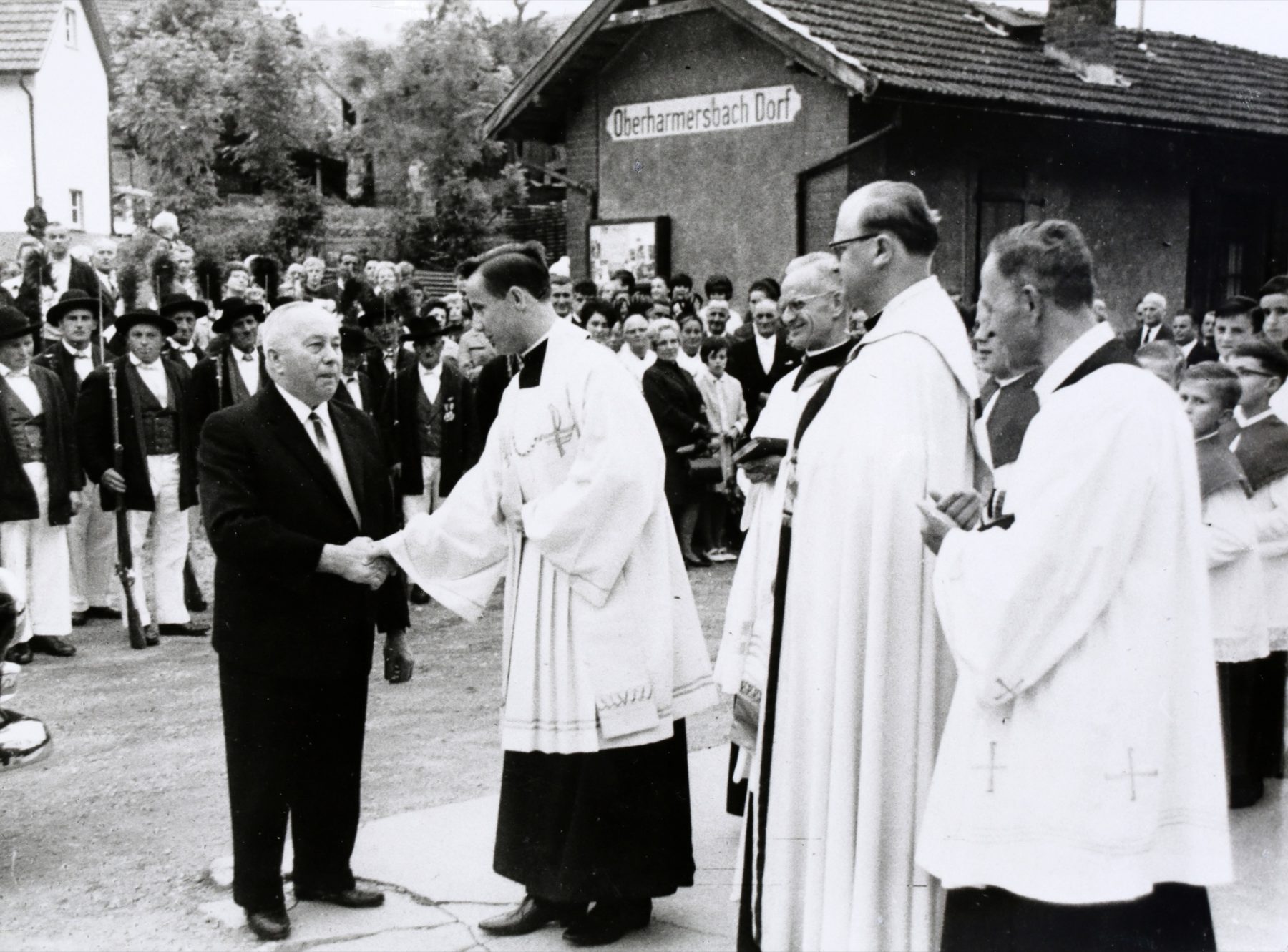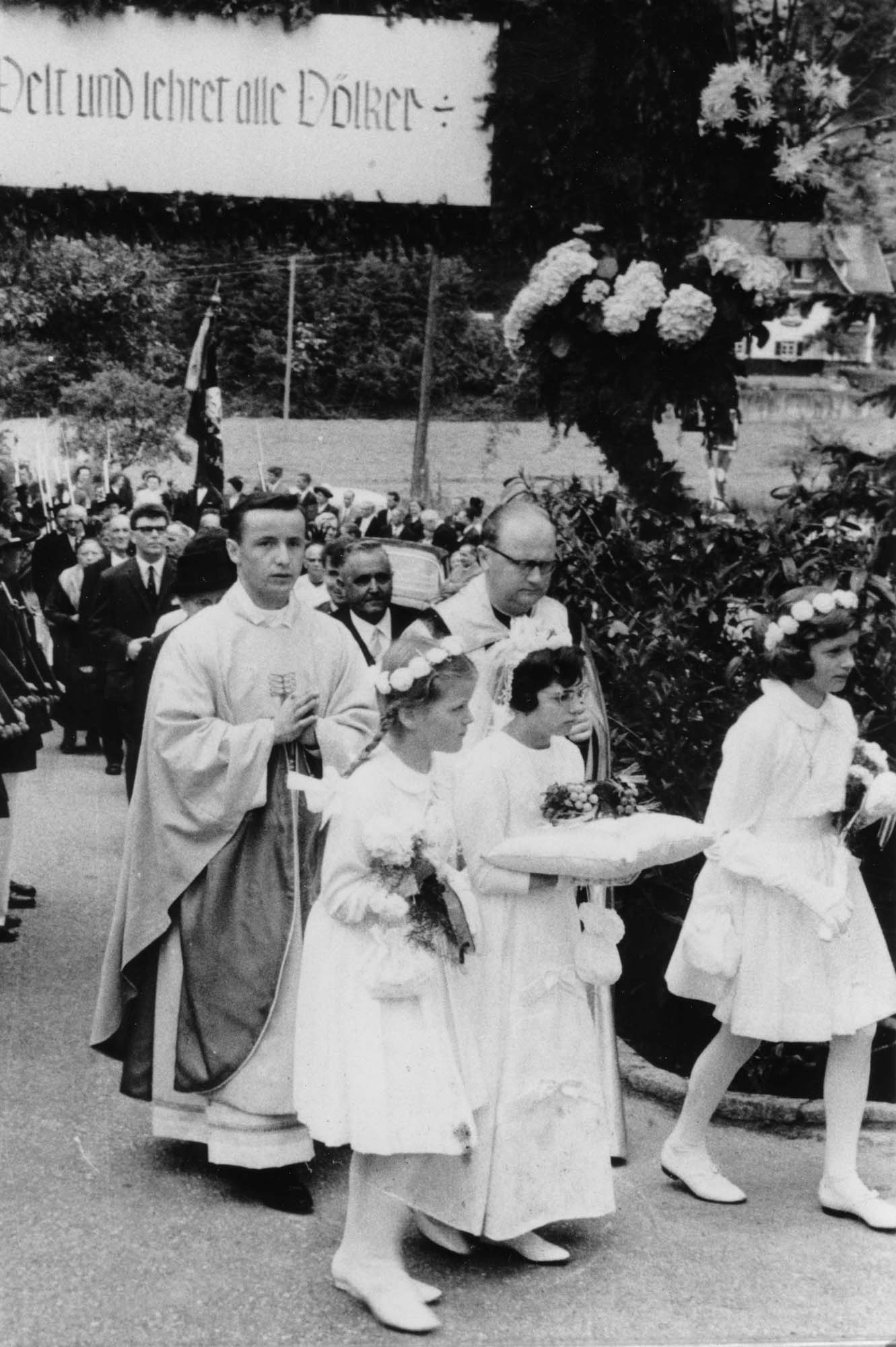 Eine Prozession mit den Kommunionkindern – der Doppeljahrgang wegen der beiden Kurzschuljahre ließ die Zahl auf über 100 ansteigen – und den Vereinen so-wie zahlreichen Kirchenbesuchern gaben dem Neupriester am Sonntag das Geleit zur Kirche. Die vom Kirchenchor einstudierte »Missa brevis« von Mozart begleiteten mehrere Musiker des Südwestfunkorchesters. Der Neupriester zelebrierte seine erste Heilige Messe zusammen mit dem damaligen Pfarrverweser Franz Bühler, dem aus Oberharmersbach stammenden Rudolf Lang, 1939 zum Priester geweiht, und Frater Gallus Haas, der fünf Jahre später seine Primiz feierte.