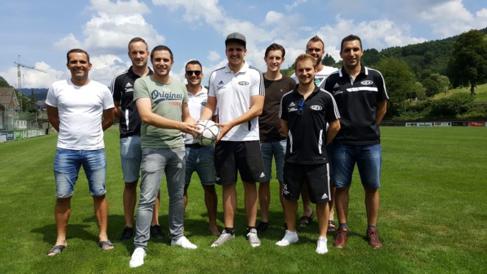 Oberharmersbach (ko). Den Spielball zur Begegnung gegen die Reserve des SV Oberachern spendete die ehemalige A-Jugendmannschaft (Jahrgang 88/89 und 90).