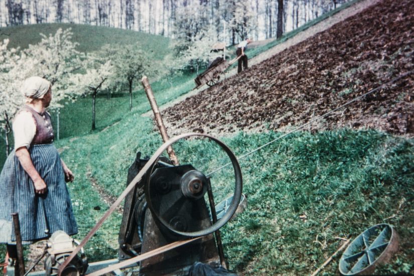 Über ein »Fläschelrad« zieht die Winde die Last den Hang hoch. Oft wurde so der vom Hang abgespülte Boden wieder oben auf den Acker verteilt, hier wird gerade Mist als Dünger ausgebracht. Wo ein solcher technischer Fortschritt nicht möglich war, kamen auch ein Kuh- oder Ochsengespann zum Einsatz. Und wenn nichts mehr anderes half, war der Mensch das »Lasttier«.