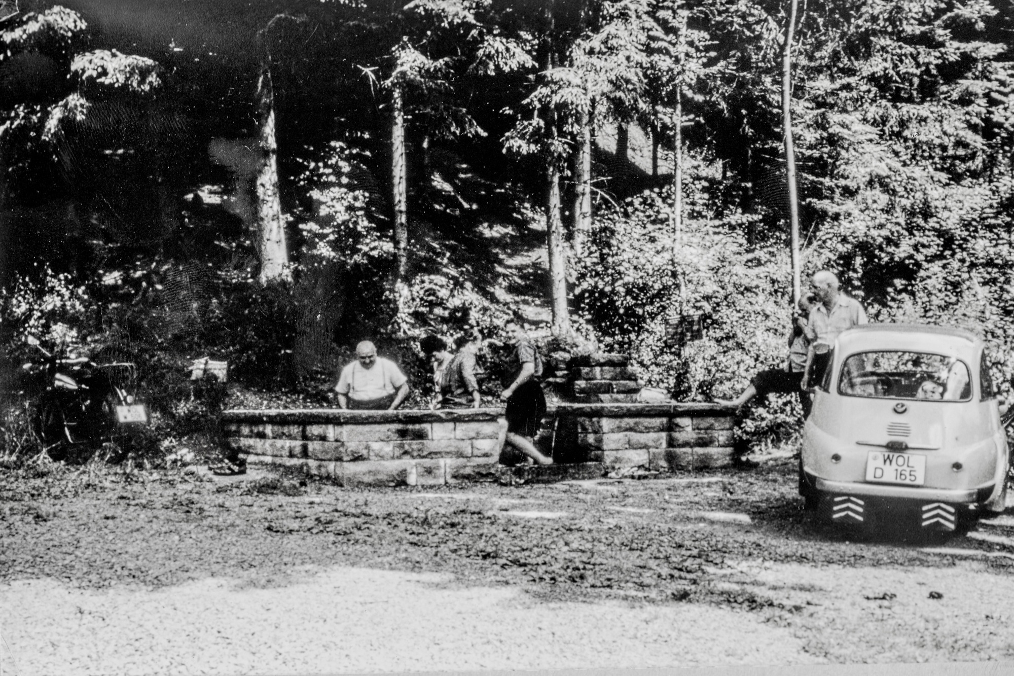 Lösung: Unser Bild zeigt die Wassertretstelle Ende der 1950-er Jahre im Jedensbachtal. Die Gemeinde Oberharmersbach schickte sich an, vor dem Hintergrund des »Wirtschaftswunders« an den durchaus erfolgreichen Tourismus der 1920-er und 1930-er Jahre anzuknüpfen. Wanderwege wurden hergerichtet und neu angelegt (die Bezeichnung »staubfreier Weg« rührt wohl daher, weil Fußgänger – einheimische wie fremde – in der Zeit vor dem Aufbringen von Teerbelägen dem durch die Fahrzeuge aufgewirbeltem Staub zu entgehen versuchten und nicht für Fahrzeuge geeignete Wege aufsuchten) und man errichtete auch eben »Wassertretstellen«, um dem Wanderer oder Feriengast eine kleine Erfrischung bieten zu können. Allseitig wurde dieses Angebot gerne angenommen, wie hier zu sehen ist.