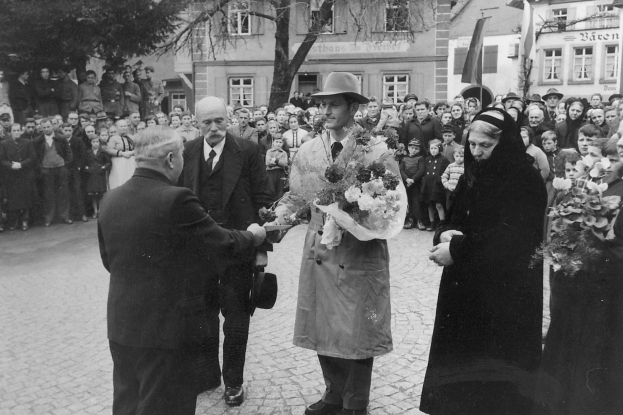 Der Wolfacher Landrat Hess und Kaplan Loritz von der Pfarrgemeinde St. Gallus gehören ebenso zum Begrüßungskomitee wie die Miliz- und Trachtenkapelle mit Dirigent August Lehmann und der Kinderchor unter der Leitung von Erwin Küderle. Bürgermeister Braun (links) gratuliert dem Heimkehrer (Mitte, zusammen mit seinen Eltern) mit einem Geldbetrag von 500 Mark, Ratschreiber Lehmann überreicht im Namen der Gemeinde einen Geschenkkorb zur »Auffrischung der Gesundheit«. Der Wolfacher Landrat begrüßt den Heimkehrer mit einem Entschädigungsgeld von 5000 Mark.