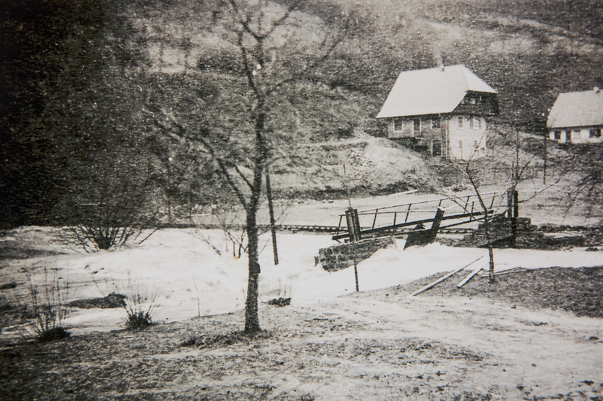 Unser Bild zeigt das Hochwasser von 1957. Im Hintergrund stehen die Häuser Isenmann (Pension »Waldfrieden«) und Rauber am Schrofen. Im Vordergrund ist das Wehr das früheren Sägewerks Lehmann im Dorf (»’untere Londels«) überflutet. Weniger Zehnermeter weiter hat die Flut an der »Katzenhalde« einen Erdrutsch versursacht, der die Verlegung eines Wanderweges auf höherem Gebiet nach sich zog. Erst mit der Flurbereinigung (»Beschleunigtes Zusammenlegungsverfahren ab 1976 hat man in der Biegung des Harmersbachs eine Sandsteinmauer errichtet und damals dann den Weg entlang des Talbaches in diesem Bereich neu angelegt (Teilstück des Hademarweges).