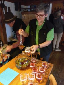 Die etwa zweistündige Tour führte die Gruppe von der Lourdesgrotte im Zuwälder Tal über das Kapellenwegli auf das Langhärdle und anschließend wieder zurück zur Gallus-Säge. Hier kamen die Teilnehmer in den Genuss einer spontanen Säge-Führung durch Manfred Lehmann vom Gallushof. Anschließend wärmte man sich im Gasthaus Linde auf und genoss die Kräuter-Bowle, die Wirtin Martina Lang vorbereitet hatte. In der Küche wurde dann gemeinsam gewerkelt, um Spaghetti mit Bärlauch-Soße, Bärlauch-Flammkuchen, Bärlauch-Paste & Co. vorzubereiten und zu kochen. Beim gemeinsamen Abendessen in der Gaststube ließ man den Nachmittag gemütlich ausklingen.