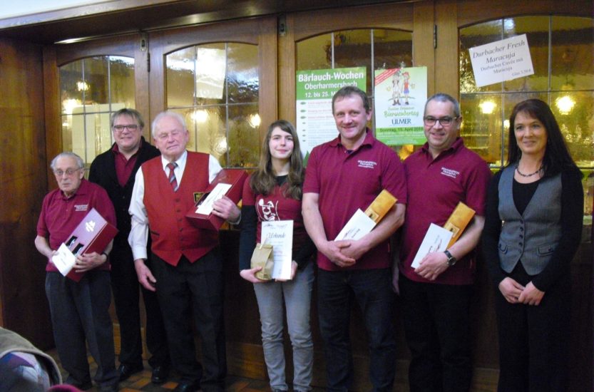 Im Namen des Deutschen und Badischen Chorverbandes und stellvertretend für Präsident Anton Unger heftete Bodmer den vier Jubilaren für ihre langjährige Treue die Ehrennadeln an und gratulierte mit der Verleihung der Urkunde.
