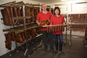 Besonders stolz ist Markus Schwarz auf seinen Schwarz­wälder Speck und Schinkenspeck. Vier Wochen wird er gesalzen, danach drei Wochen geräuchert und dann im Reiferaum weitere rund 14 Wochen getrocknet. Die lange Lufttrocknung bei gleichbleibender Temperatur sorgt für die hohe Qualität. Kurz vor dem Verkauf kommen Speck und Schinkenspeck nochmals in die Räucherkammer und erhalten damit ihren unverwechselbaren Geschmack – und machen dann »Lust auf Schwarzwald«.