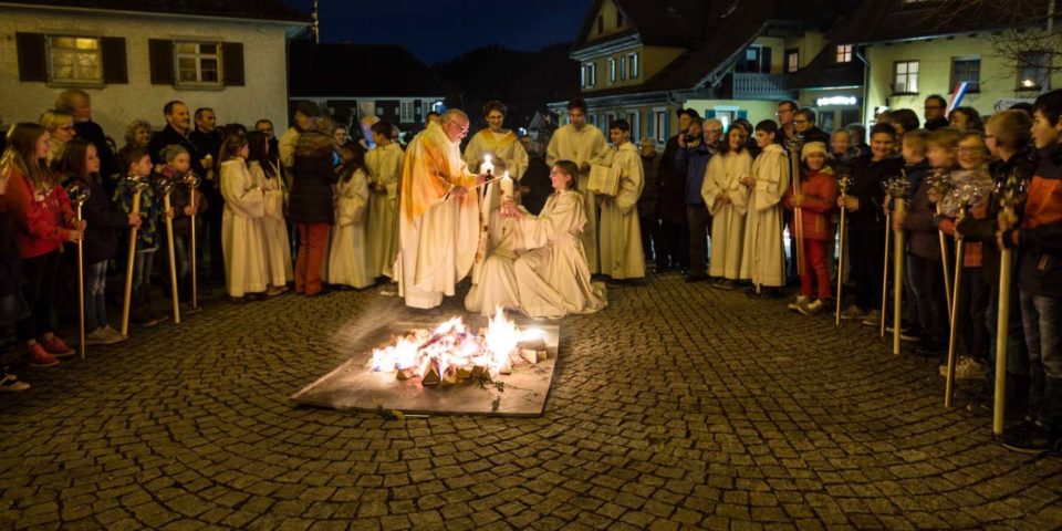 Traditionell brannte vor dem Eingangsportal der Pfarrkirche St. Gallus am Karsamstag-Abend ein Feuer, als sich die Gläubigen zur Auferstehungsfeier hier versammelten. Pfarrer i.R. Johannes Goroll entzündete nach dem Segen und dem Zeremoniell der fünf Wundmale die Osterkerze. Gemeinsam mit den Kommunionkindern, die den Gottesdienst mitgestalteten, zogen die Gläubigen in das dunkle Gotteshaus, das sich nach und nach erhellte. Unser Bild zeigt das Entzünden der Osterkerze.